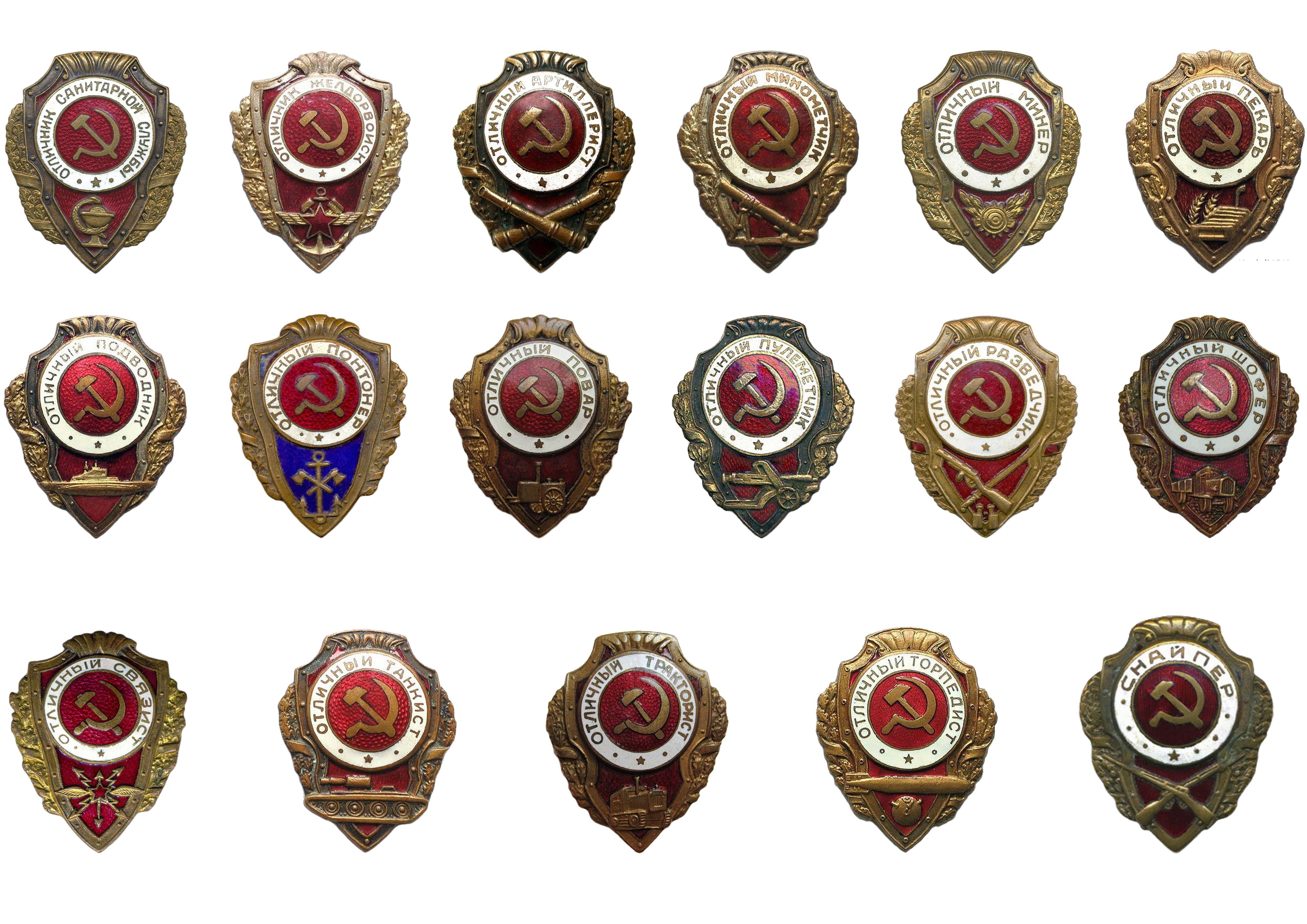 В 1943 году были учреждены еще девять новых знаков: 10 марта - «Отличный разведчик», 3 апреля — «Отличный связист», 5 апреля - «Отличный понтонер», 30 апреля«Отличник ПВО», 8 июля – «Отличный шофер», «Отличный дорожник», «Отличный повар», «Отличный пекарь» и 10 сентября — «Отличный тракторист».
