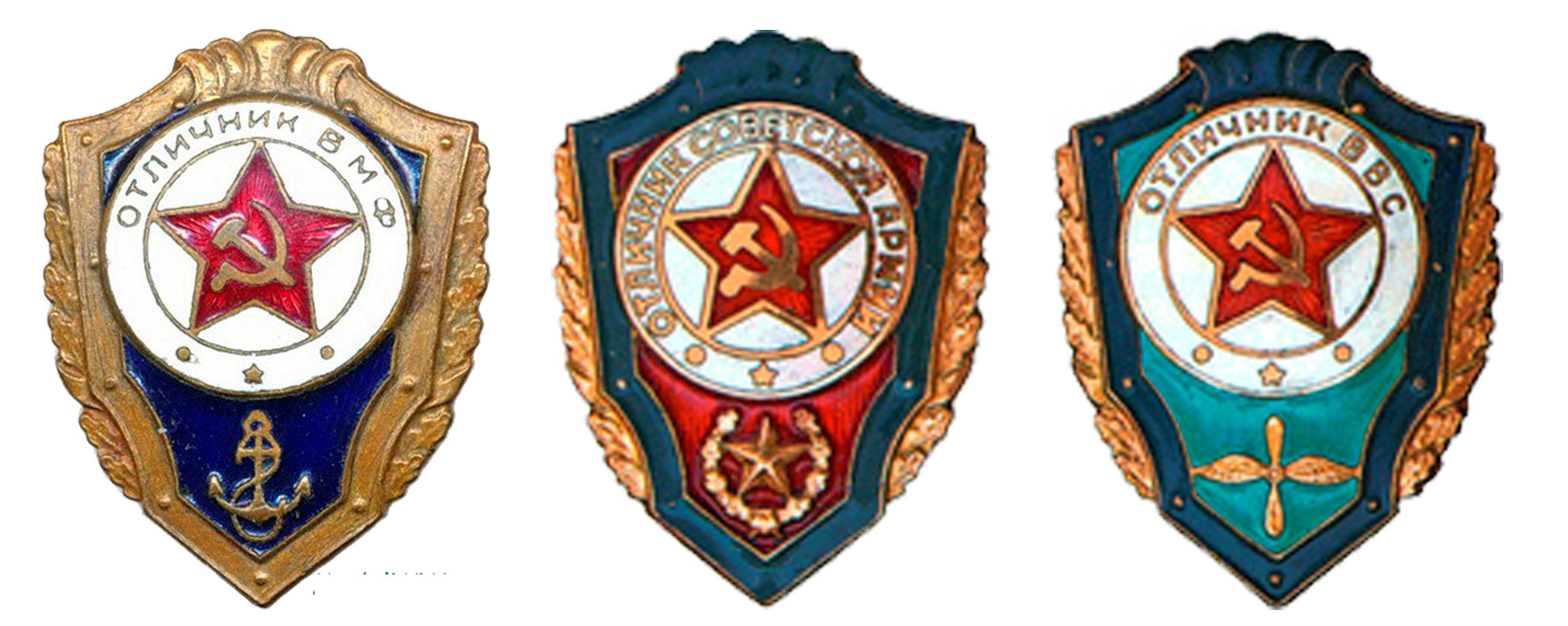 Приказом министра обороны СССР Маршала Советского Союза Г.К. Жукова № 67 от 17.04.1957 года знаки «отличников» были отменены. Вместо них были введены всего три: «Отличник Советской Армии», «Отличник ВМФ» и «Отличник ВВС».