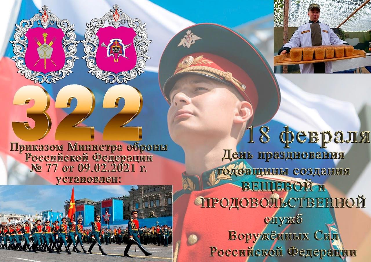 От всей души поздравляю специалистов вещевой службы, соратников, ветеранов вещевой службы, тружеников научных и производственных организаций, фабрик, заводов (да, есть и заводы), сотрудничающих с вещевой службой, людей, искренне увлечённых историей военной формы одежды России, историков, исследователей, читателей, с 322-летием со дня образования вещевой службы.