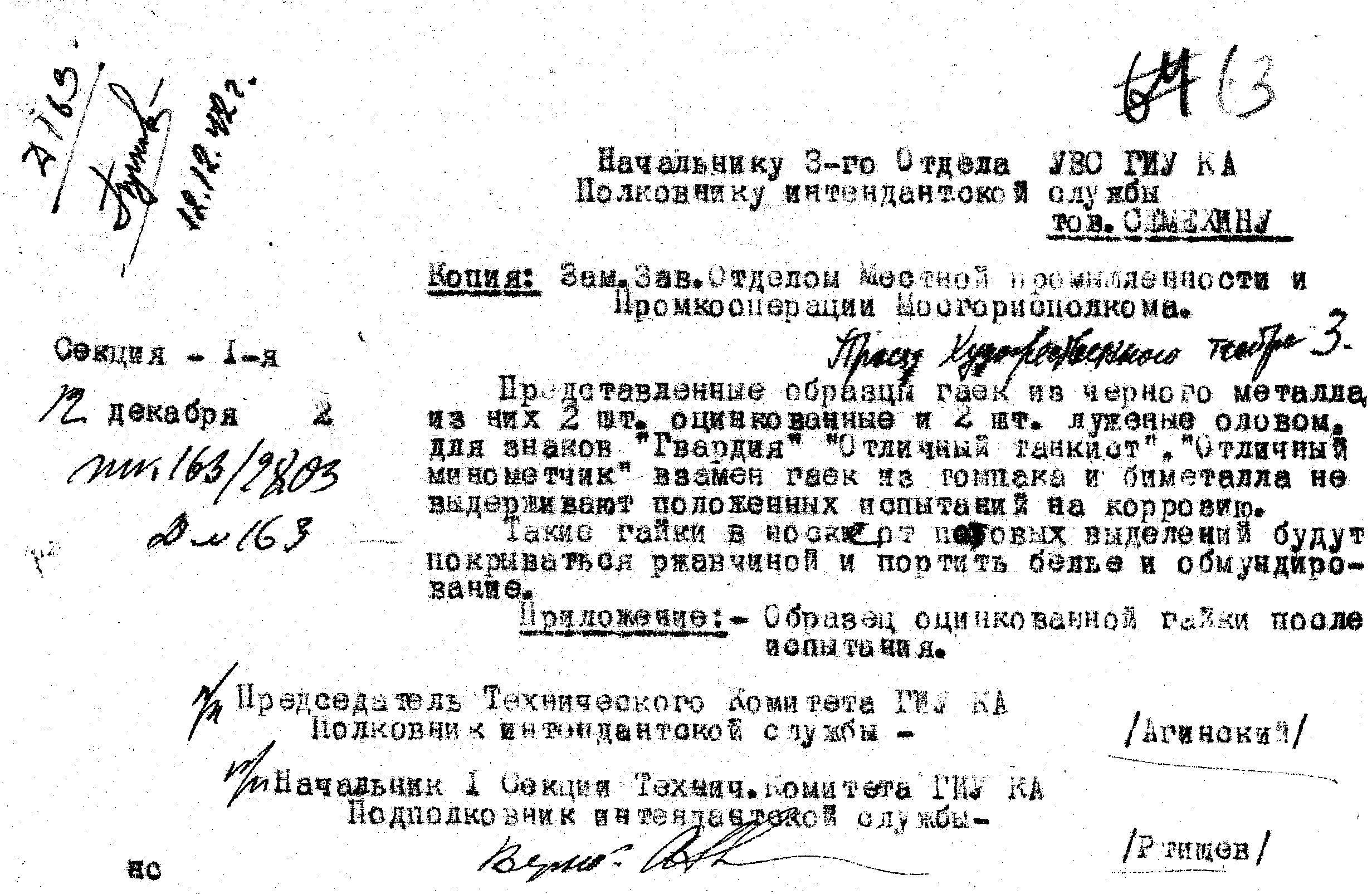 Сложности были не только со знаками отличия, но даже и с изготовлением качественного крепления их к обмундированию. Проводились испытания гайки крепления, нельзя было допустить, чтобы они покрывались ржавчиной и тем самым портили обмундирование и бельё.