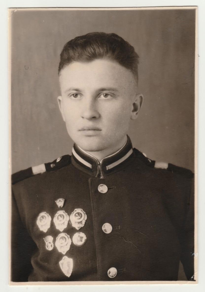 Фотография лейтенанта РККА СССР с нагрудным знаком «Отличный артиллерист»