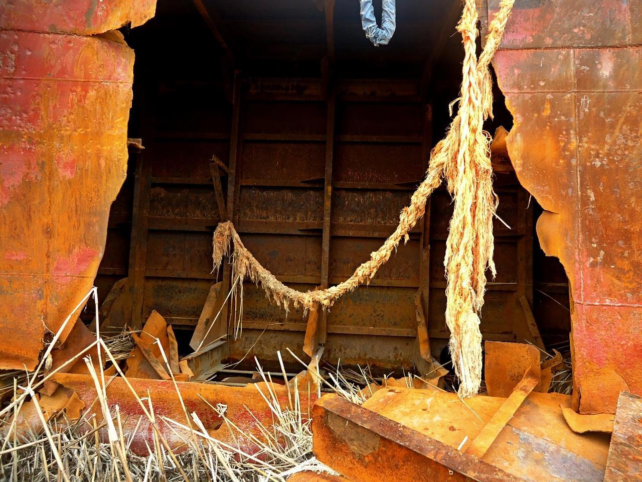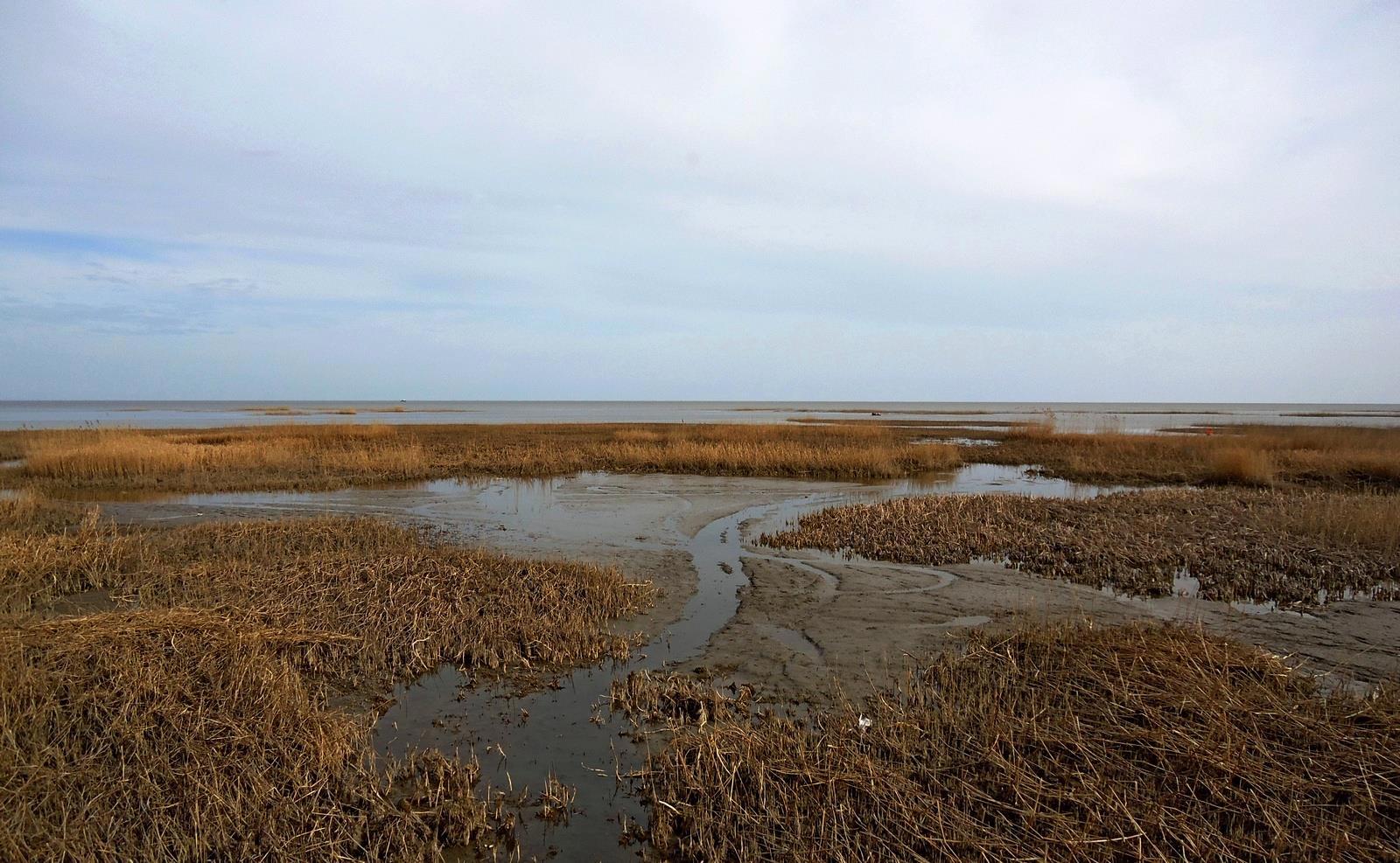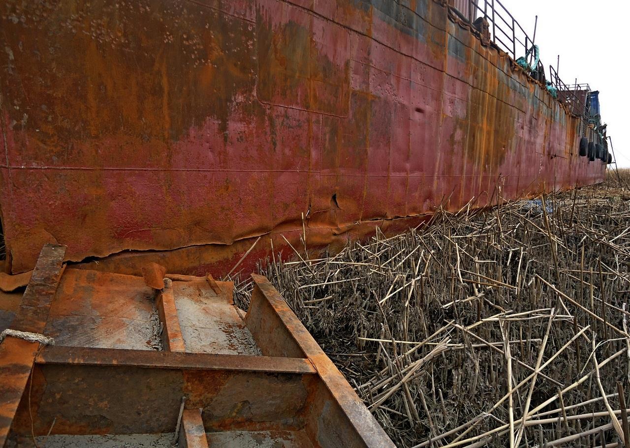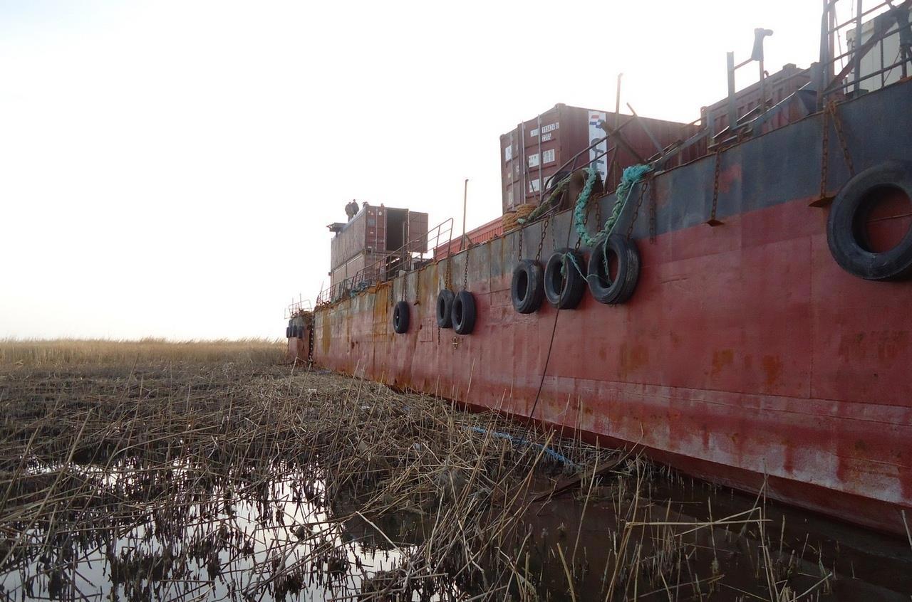 И да – это длиной около 100 м, шириной больше 21 м и с высотой борта 4,5 метра лежит в солёном болоте на самом деле далеко от «открытой воды». Посмотрите на фото. Это снято с палубы судна. Море – там, расстояние сами на глаз прикиньте. А теперь главное – это судно (баржа) в это болото никто не затаскивал. Его туда занесло штормом. Никаким не особым – самым обычным Каспийским штормом: