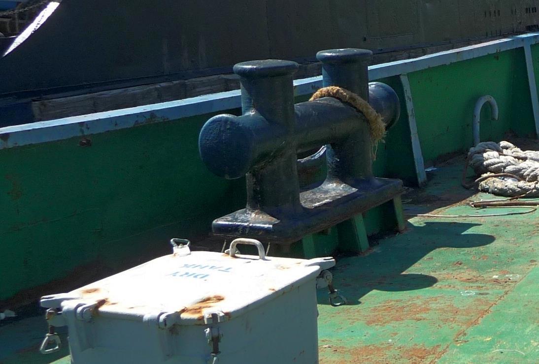 Размеры… высота «заборчика» за ним (фальшборта) – 1100 мм. Кнехт двухтумбовый крестовый. Солидная литая конструкция. А вот что иногда случается с такими деталями устройств: