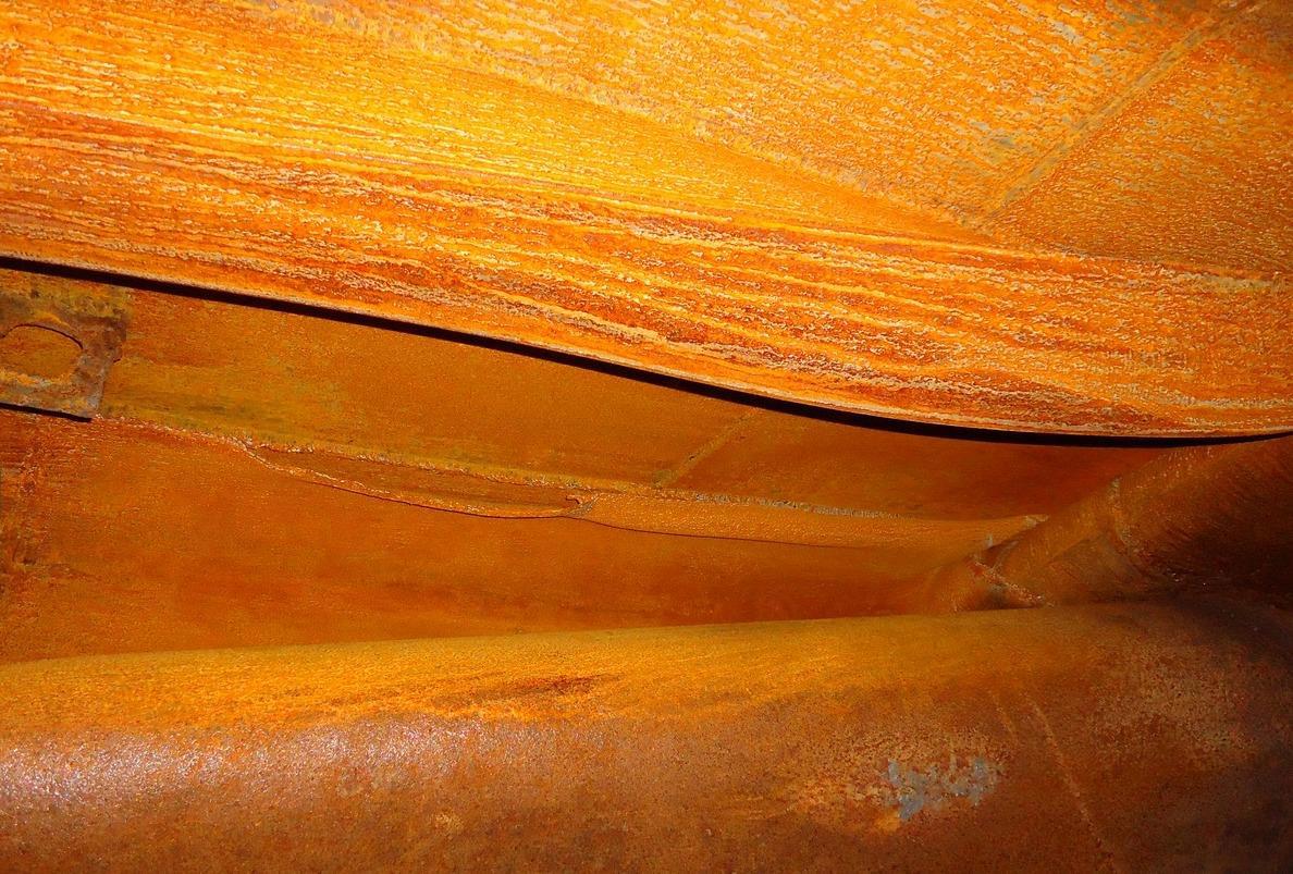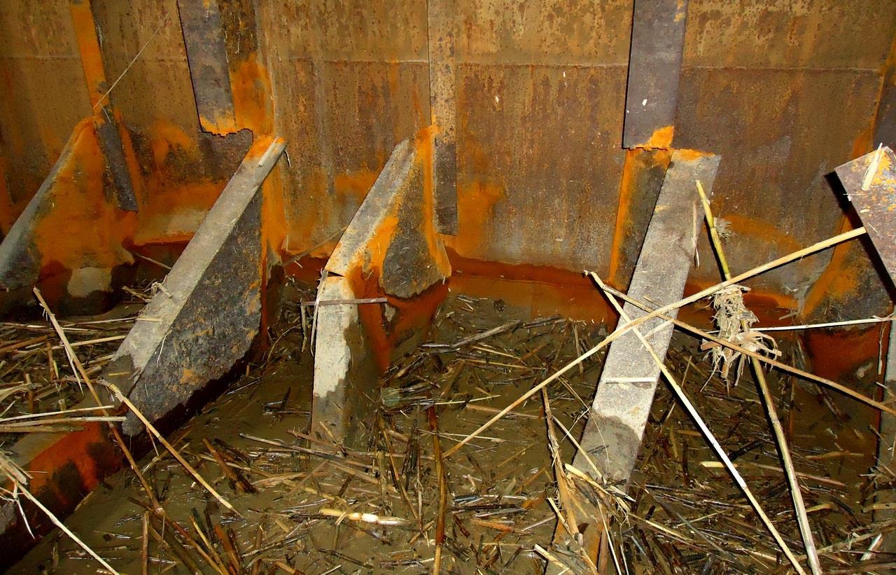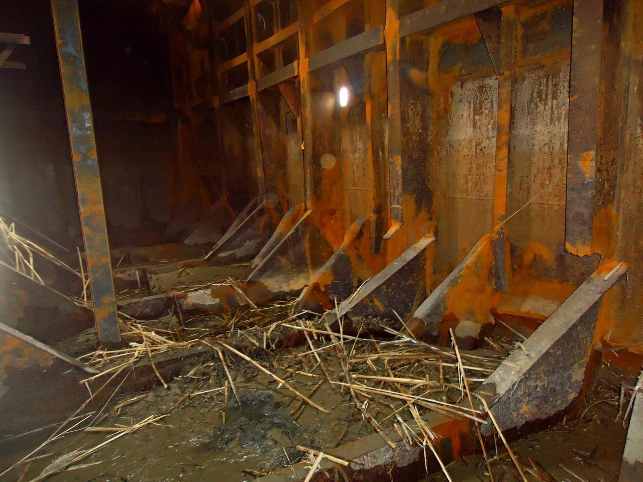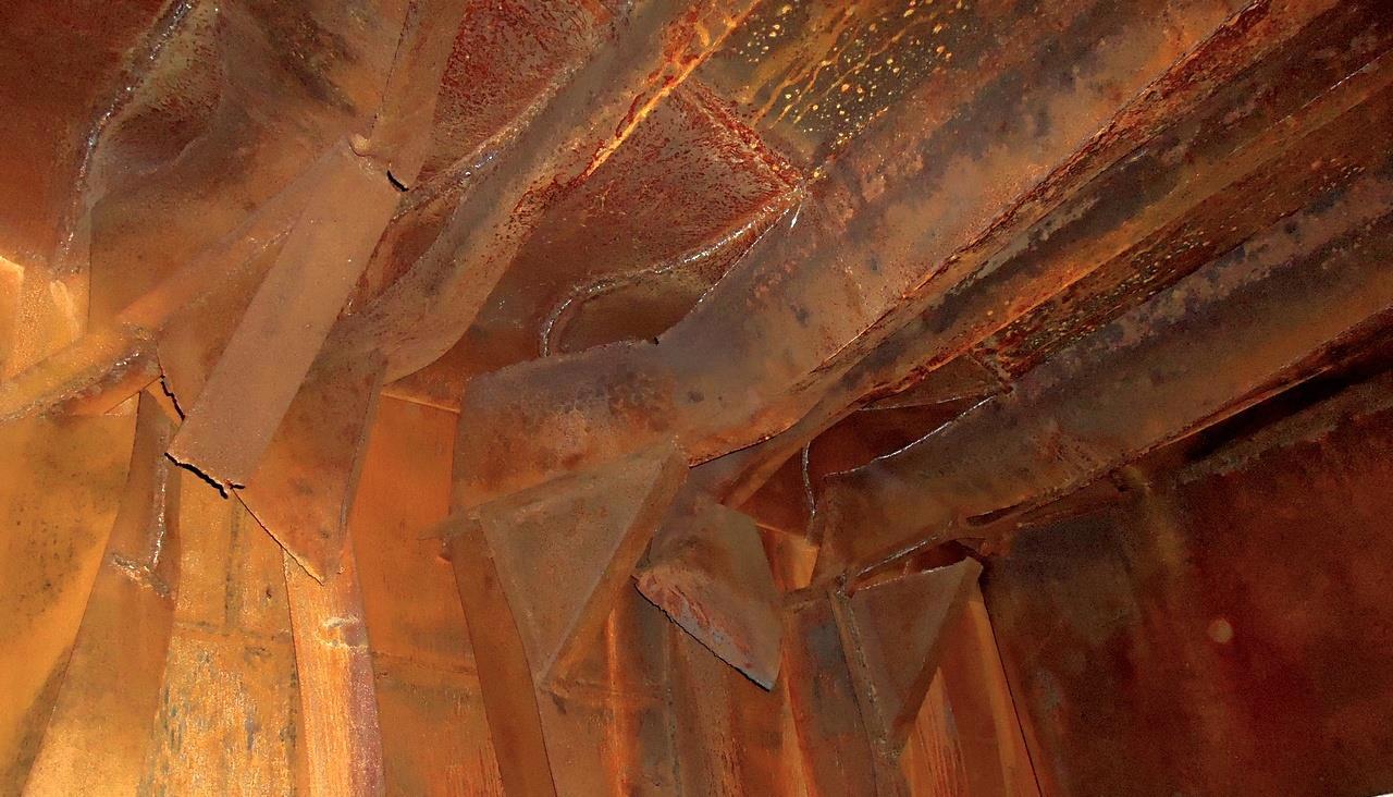 Заглянем во внутрь? Вот фотка внутреннего «сухого отсека». Посмотрите внимательно на разорванные связи и соединяющие их треугольные детали (кницы). Толщины тоже не маленькие (10-12 мм):