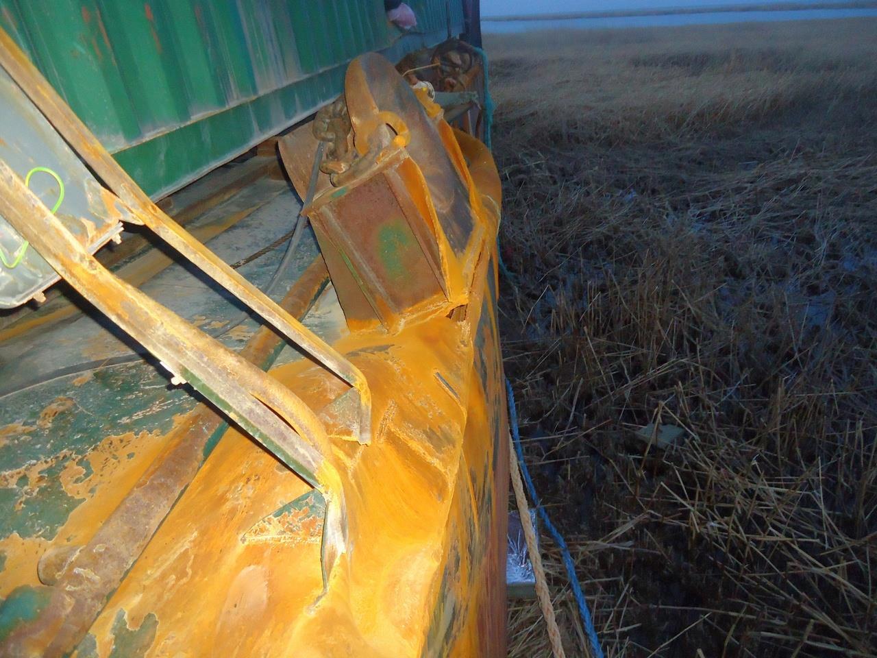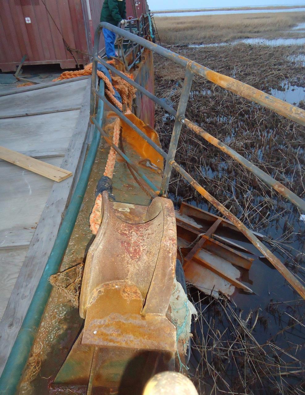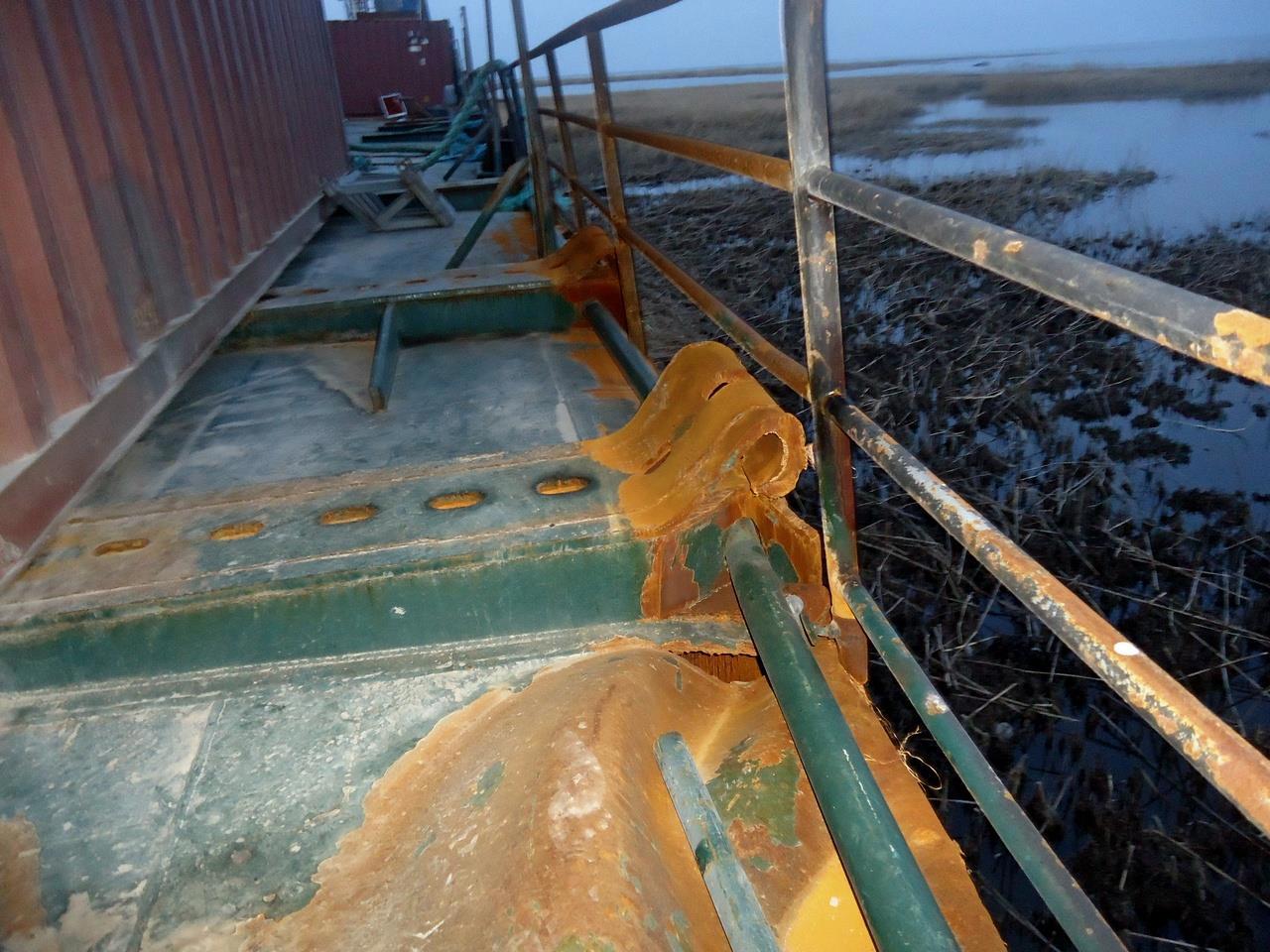 А вот так выглядит смятый участок палубы. Ну, ладно, палуба – она тоненькая (12 мм), а вы посмотрите на полку фундамента, завёрнутую трубочкой (толщина полосы – 24 мм) и на ещё один палубный клюз: