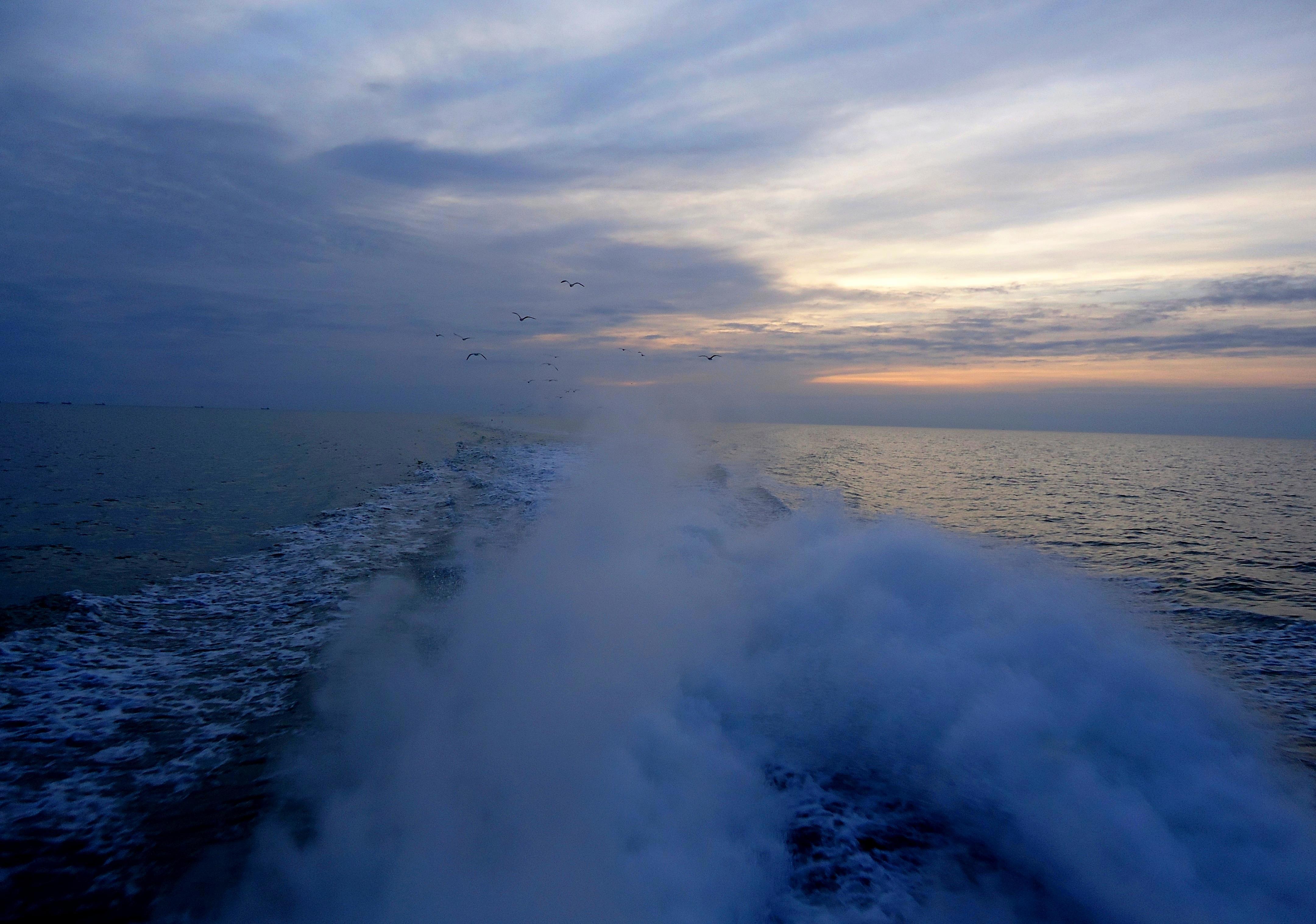 Всё. Осмотр произведён. Пора домой. Можно задумчиво посмотреть на красивый след, остающийся за кормой быстроходного катера и пофантазировать о том, что чайки на самом деле не из яиц вылупляются, а рождаются прямо из пены и брызг морских: