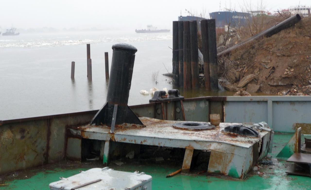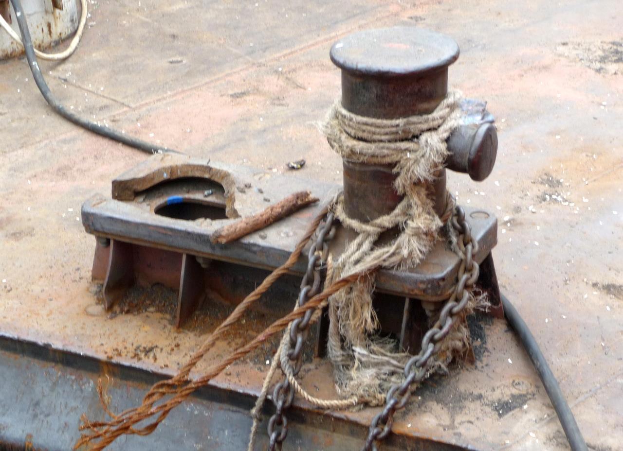 Это кнехты судов, которые тоже попали в неприятности, но благополучно вернулись в порт. Но эта баржа в порт не вернулась. А вот, что осталось от одного из её кнехтов: