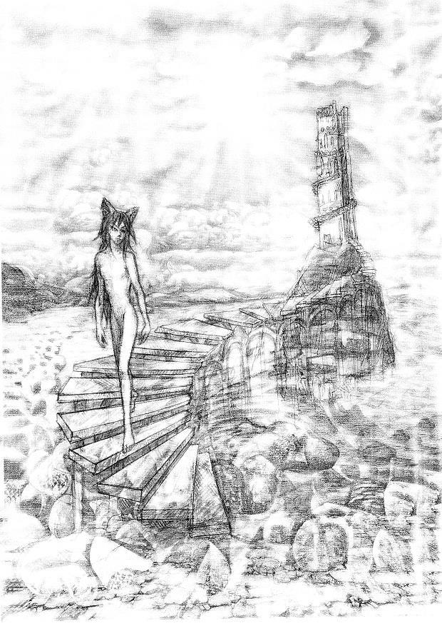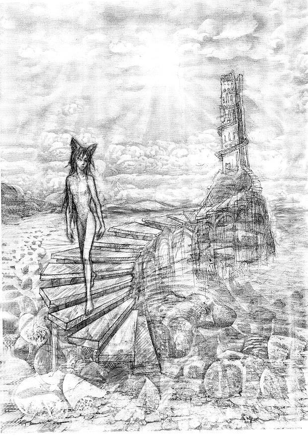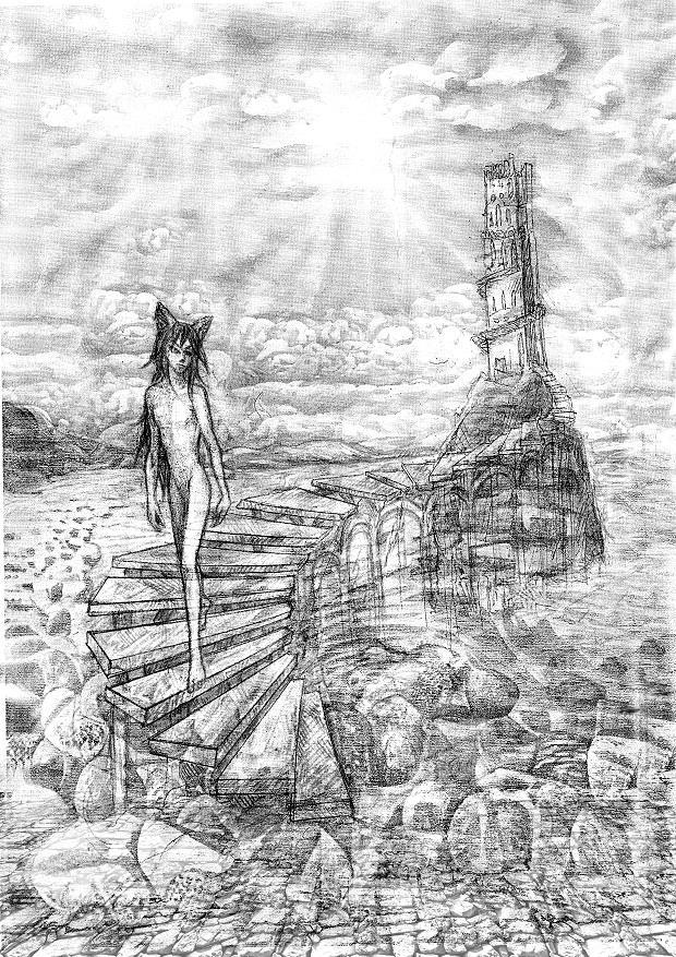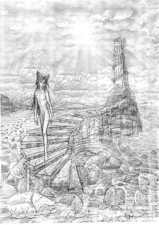 С невиданной тщательностью нарисован галечный берег, накатываются волны морские, хлопья пены в воздухе застыли. Над морем, из волн, из туманной дымки над ними вырастает башня маяка (?), и по ступеням, свернувшимся спиралью, выходящим из волн морских, сходит к вам нагой юноша, похожий на... Аэрлиса? Тьела? Кого-то еще? Наверное, всё таки, на Аэрлиса, потому что ушки кошачьи есть, а хвоста нет.За башней тонет в океане солнце.