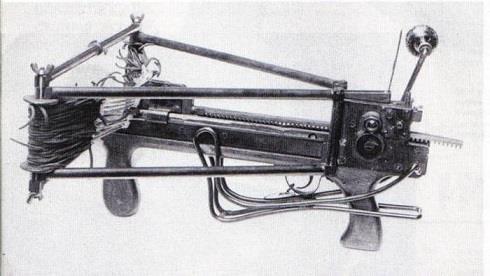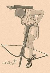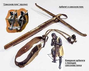 Еще один сильно подзабытый арбалет с способом перезарядка при помощи Самсонова пояса. Крюк для взвода тетивы располагался на поясе. Вот ни разу не встречал, что б попаданец увидел подобный арбалет.