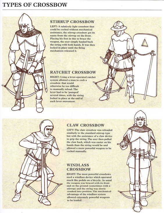 Как правило в подавляющем случае арбалеты у писателей (те книги что я читал) однотипные. Перезарядка ведется с помощи рычага, так называемой "козьей ноги". Если писатель хочет экзотики, то описывают многозарядные по типу Чо-ко-ну, но и в этом случае это тот же принцип рычага. Герои второго плана могут использовать арбалеты с воротом, но и это большая редкость. История же знает и другие примеры, которыми можно разнообразить вашу вселенную и малость удивить неподготовленного читателя.