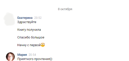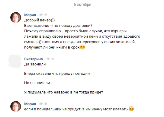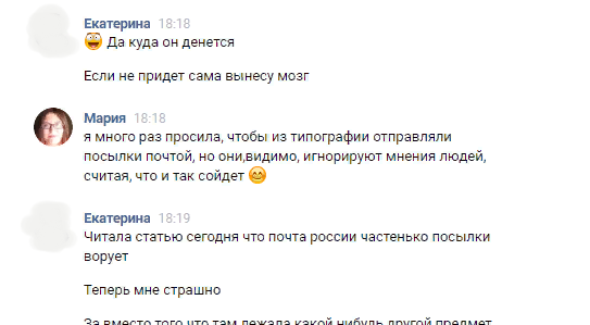 Я забочусь о своих читателях, чтобы они получали книги в срок, без задержки и эксцессов. Сама периодически отслеживаю посылки, потому что считаю себя в какой-то мере обязанной человеку. Он выиграл книгу и я не могу его обмануть, даже если моей вины тут не будет.