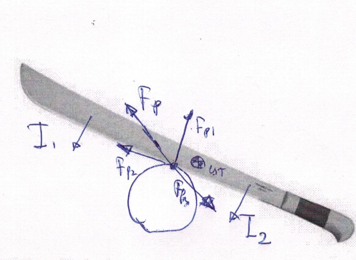 Когда сабля бьёт лозу, сабля испытывает реакцию лозы N, и по закону Ньютона для центра масс, с учётом отсутствия реакции в области рукоятки, получается, что: