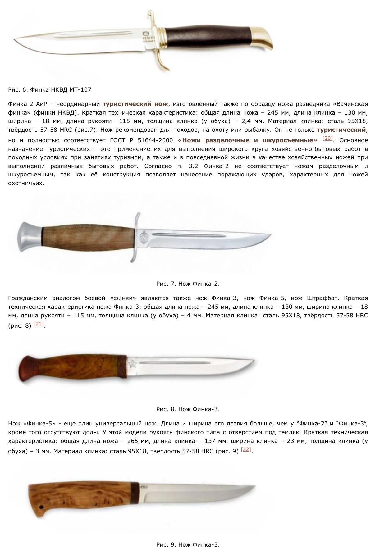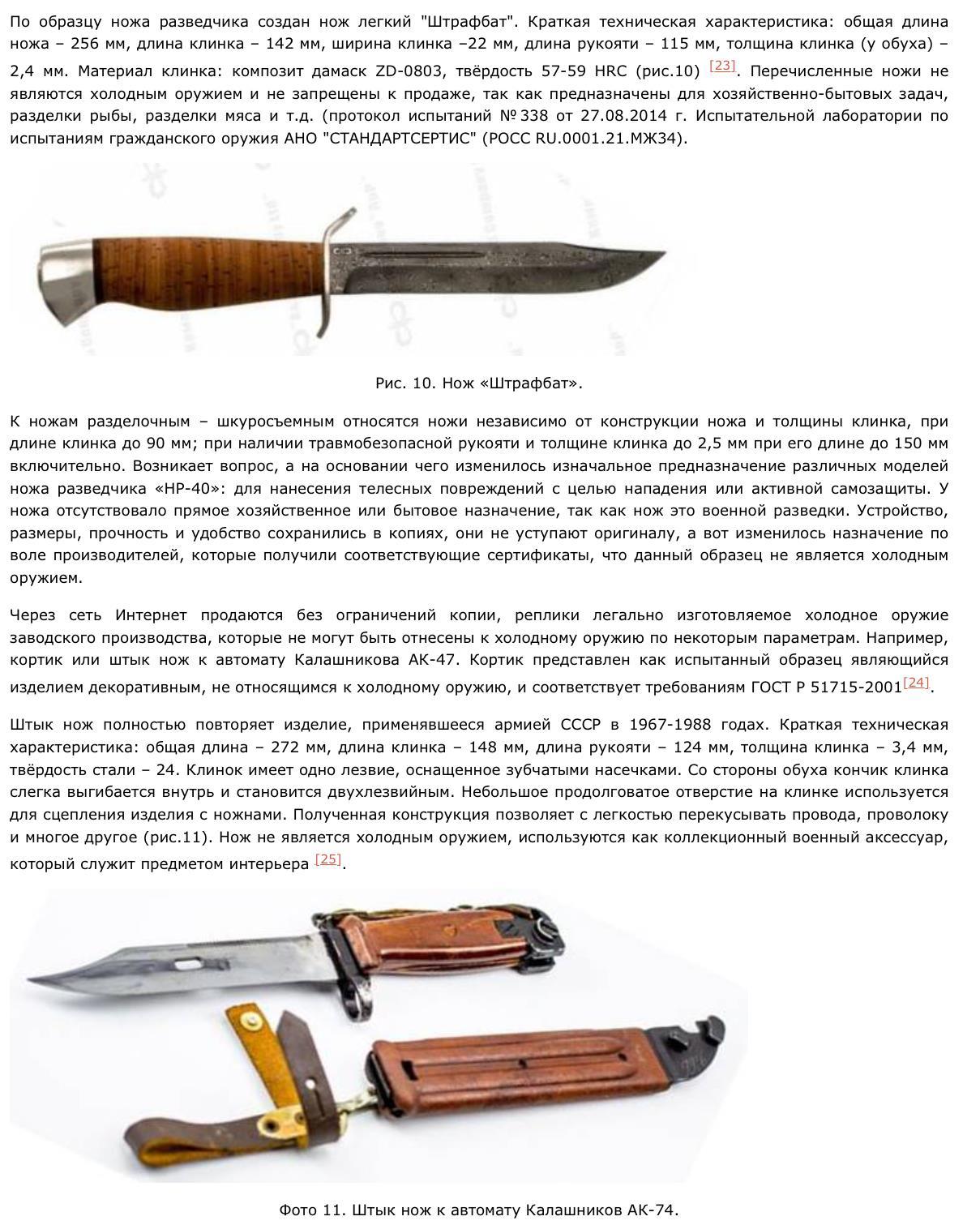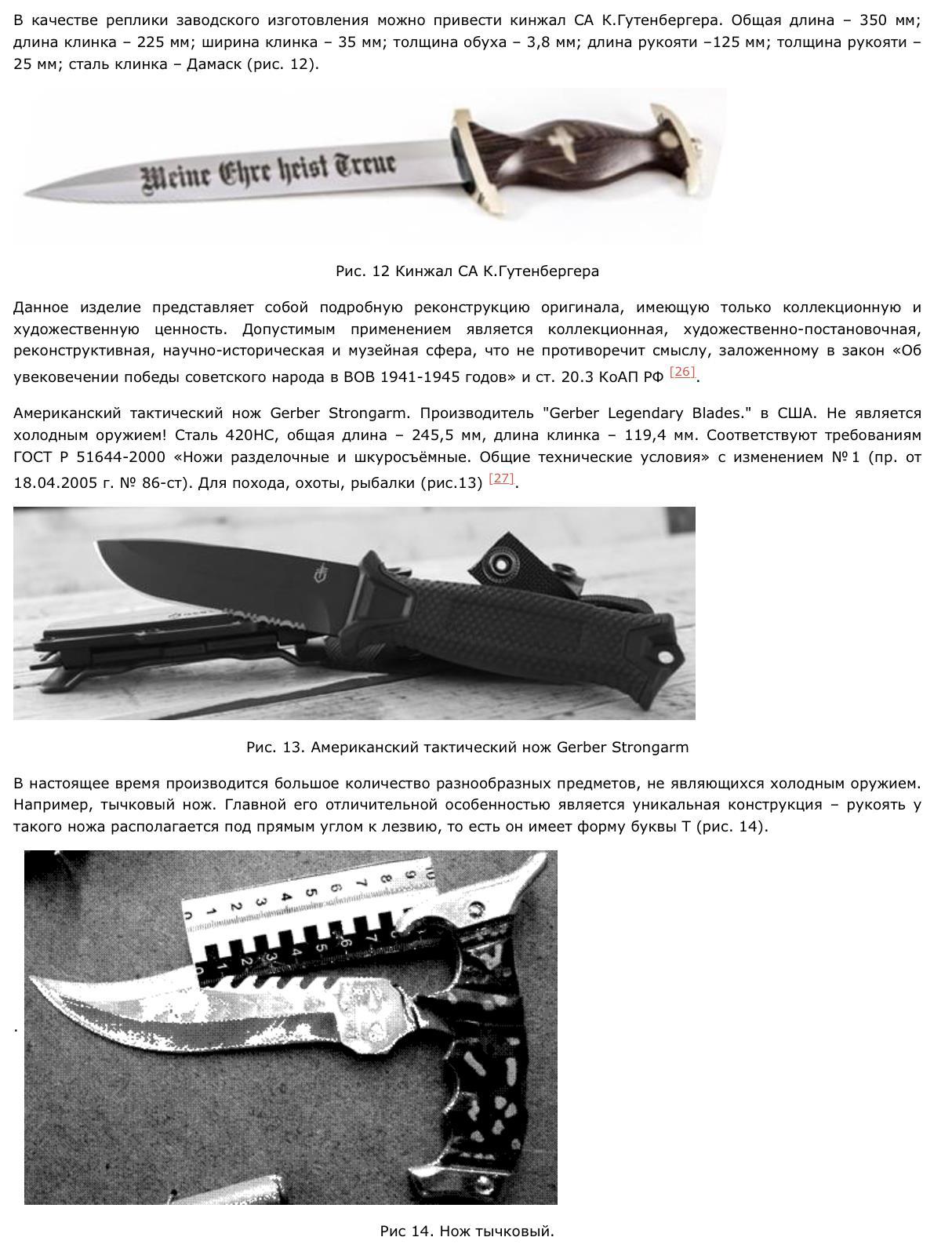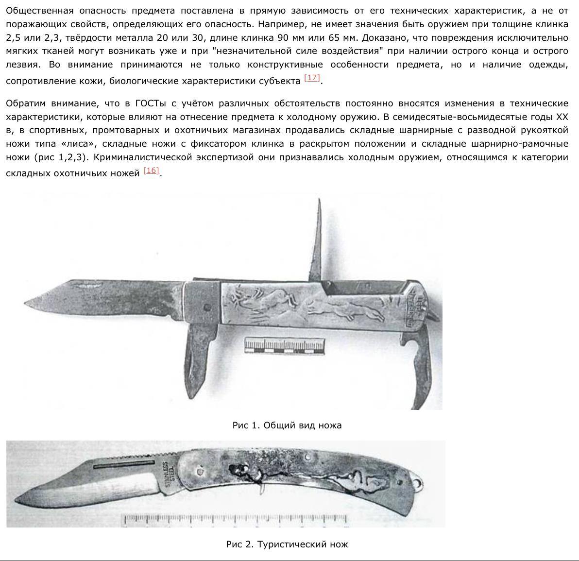 1) По законодательству есть чёткие признаки отнесения ножа к холодному оружию (ХО). Если хоть один признак отсутствует, то предмет становится хозяйственно-бытовым (ХБ) инструментом, конструктивно сходным с боевых оружием. Ну то есть вот есть копия советского ножа разведчика, но толщина клинка в обухе - меньше 5 мм. Всё, только за одно это несоответствие - этот нож уже не ХО. Потому что суть ХО - это гарантированное нанесение смертельного колющего удара. Не рубящего, не режущено, а только колющего. Потому что рубить и резать - это удел ХБ, колоть насмерть - ХО. Поэтому боевые ножи толстые в обухе, чтобы не сломаться от пробивания элементов снаряжения и одежды, с травмобезопасной рукоятью, исключающей соскальзывание пальцев на лезвие, с геометрией клинка, подходящей для укола. А копия финки с 2.5 мм на обухе - это, простите, хлебный нож, а не боевой и не охотничий. Да, такой финкой тоже можно убить - как и отвёрткой, но тогда и финку, и отвёртку признают ХО - по факту применения, а не по их характеристикам. Если, например, ударить человека резиновым дилдо, то в суде оно будет классифицировано как холодное оружие ударно-дробящего действия. Со всеми печальными последствиями для того, кто его применил как дубинку. Тут же в статье "эксперт" кладёт своё спекулятивное мнение на букву закона и ГОСТы, определяющие ХО, и размышляет так - на финку похоже, ну точно значит не ХБ, финками же убивали на войне... Ну офигеть!