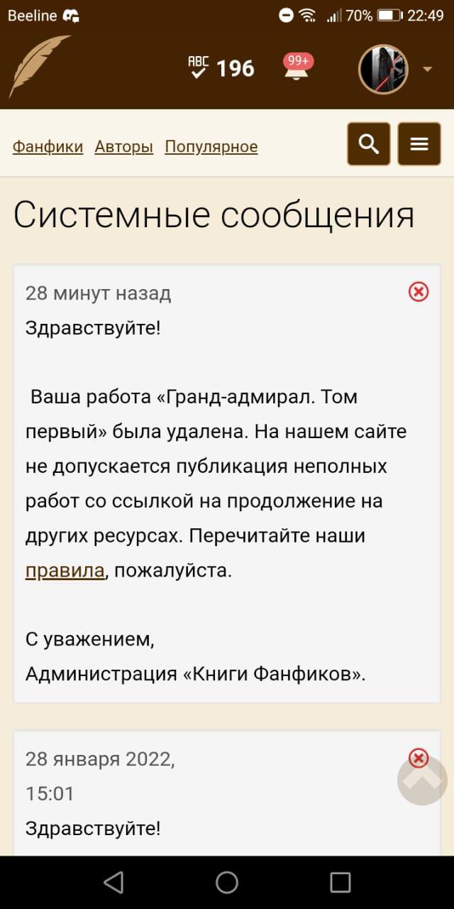 Автор: Илья МодусСижу, пишу очередную проду по ГА, и решаю на Фикбуке ответить на пару комментов к работе. Захожу... и не нахожу "Гранд-адмирал"-а в списке своих работ)) Но зато есть сообщение от безумной администрации.