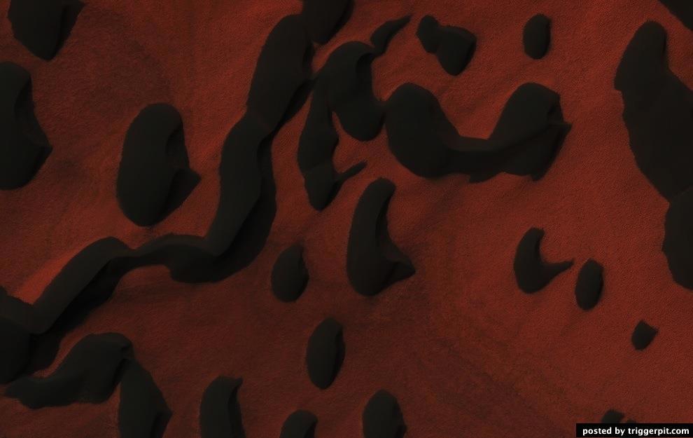Дюны кратера Рассел. Фотографии, сделанные в кратере Рассела, изучаются многократно с целью отслеживания изменения ландшафта. На этом снимке показаны отдельные темные образования, которые, вероятно, возникли под воздействием многократных пылевых бурь, которые унесли светлую пыль с поверхности дюн. Узкие каналы продолжают формироваться на крутых поверхностях песчаных дюн. Углубления в конце каналов могут быть тем местом, где накапливались блоки сухого льда перед тем, как перейти в газообразное состояние. Автор текста: Кен Херкенхофф (9 марта 2011 года) (NASA/JPL/University of Arizona)