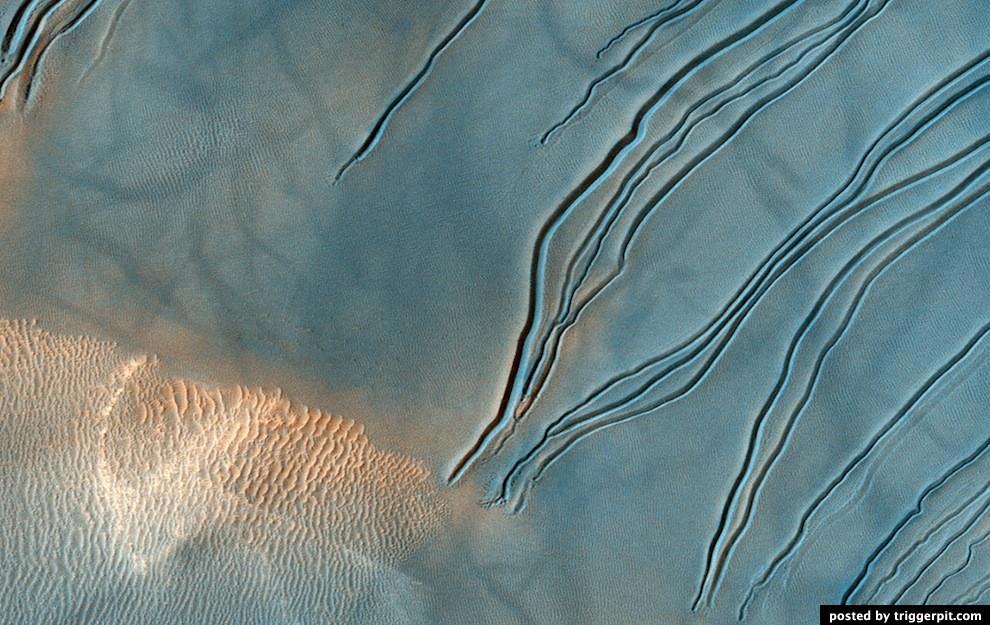 Песчаные насыпи, образованные в результате весенних песчаных бурь на Северном полюсе. (NASA/JPL/University of Arizona)