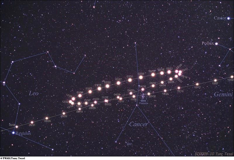 Показанная здесь картинка — это последовательность снимков, совмещенных при цифровой обработке так, чтобы изображения звезд совпадали. Видно, что Марс описывает петлю на небе. В середине петли Земля находилась ближе всего к Марсу, и попятное движение было самым быстрым.