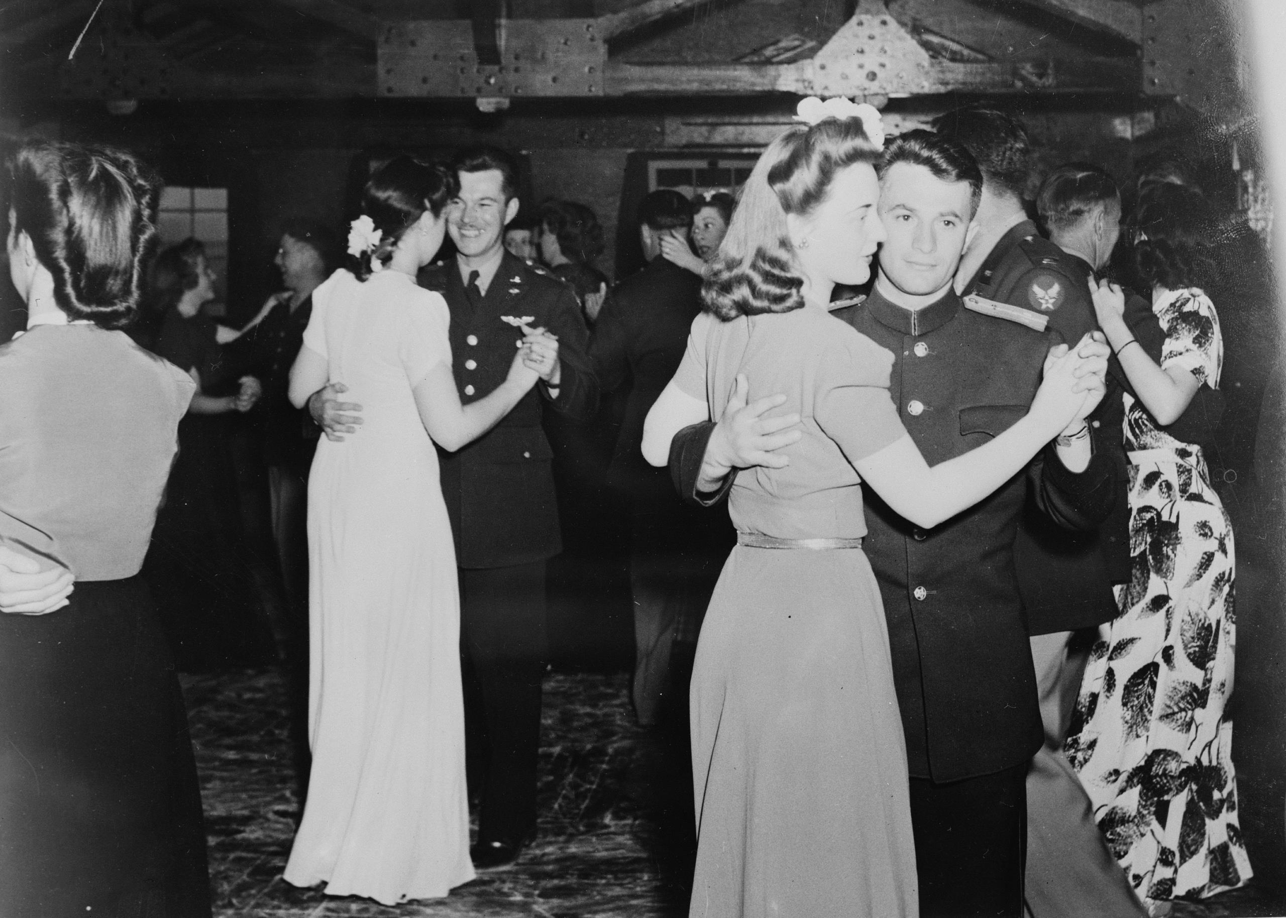 Советские и американские авиаторы танцуют с девушками в клубе аэродрома Ноум (Nome) на Аляске. 1943 год.