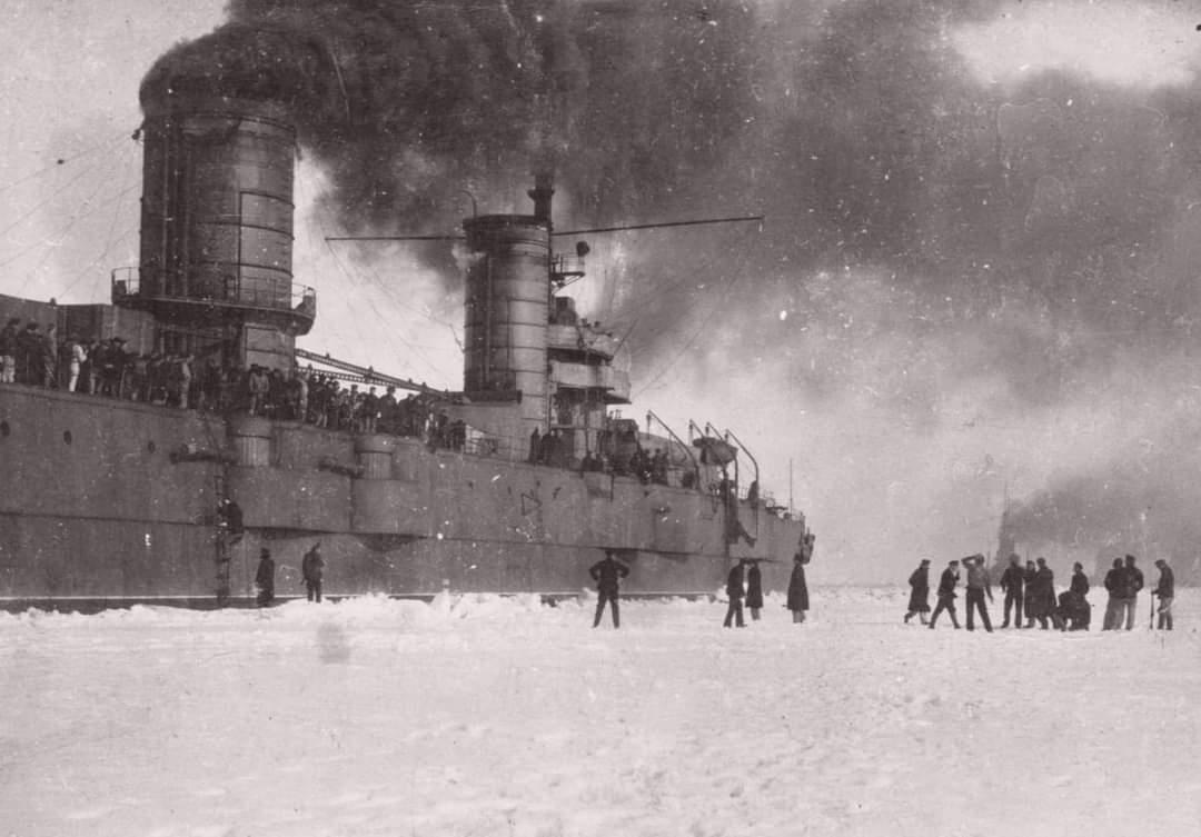 Линкор идёт, прорываясь через 3-х футовый лёд из Хельсинки.