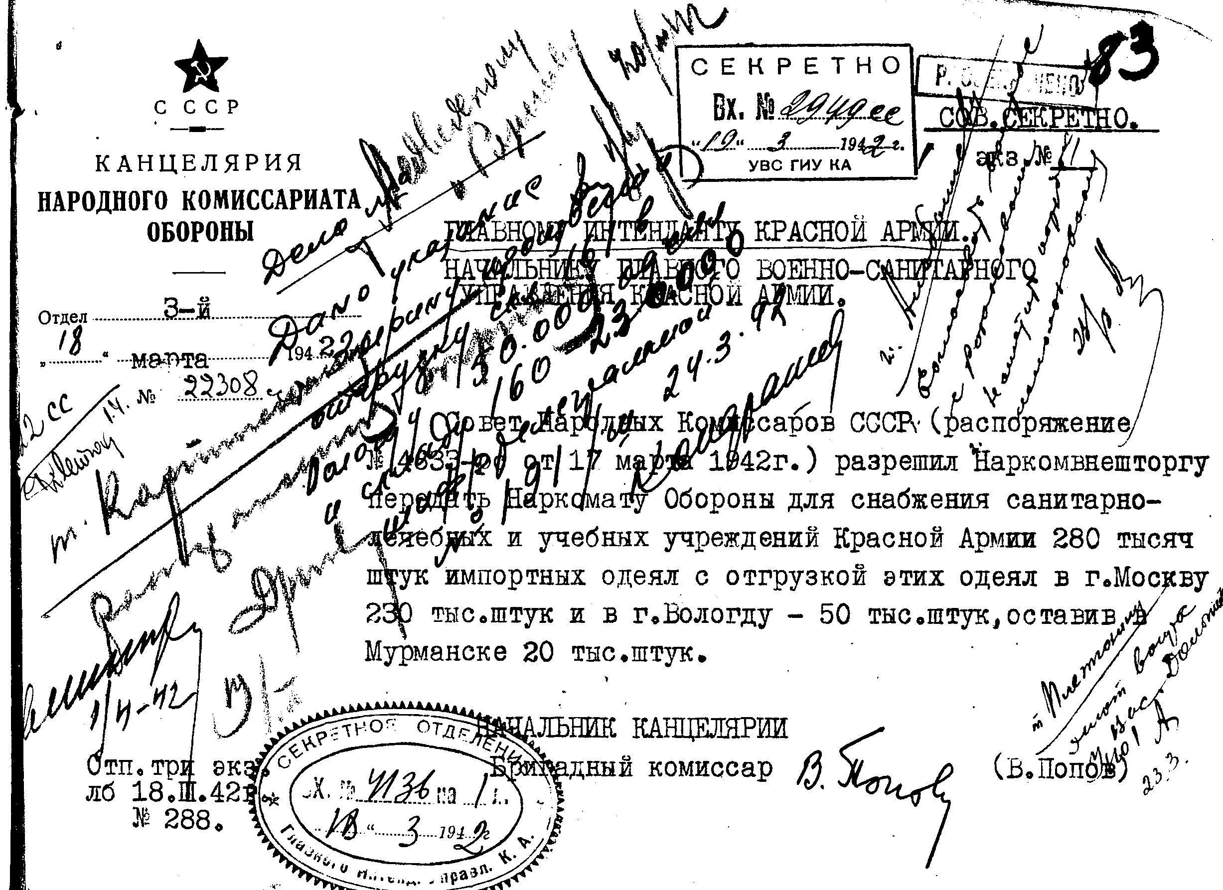 д/с: распоряжение о передаче одеял для снабжения санитарно-лечебных и учебных учреждений Красной Армии