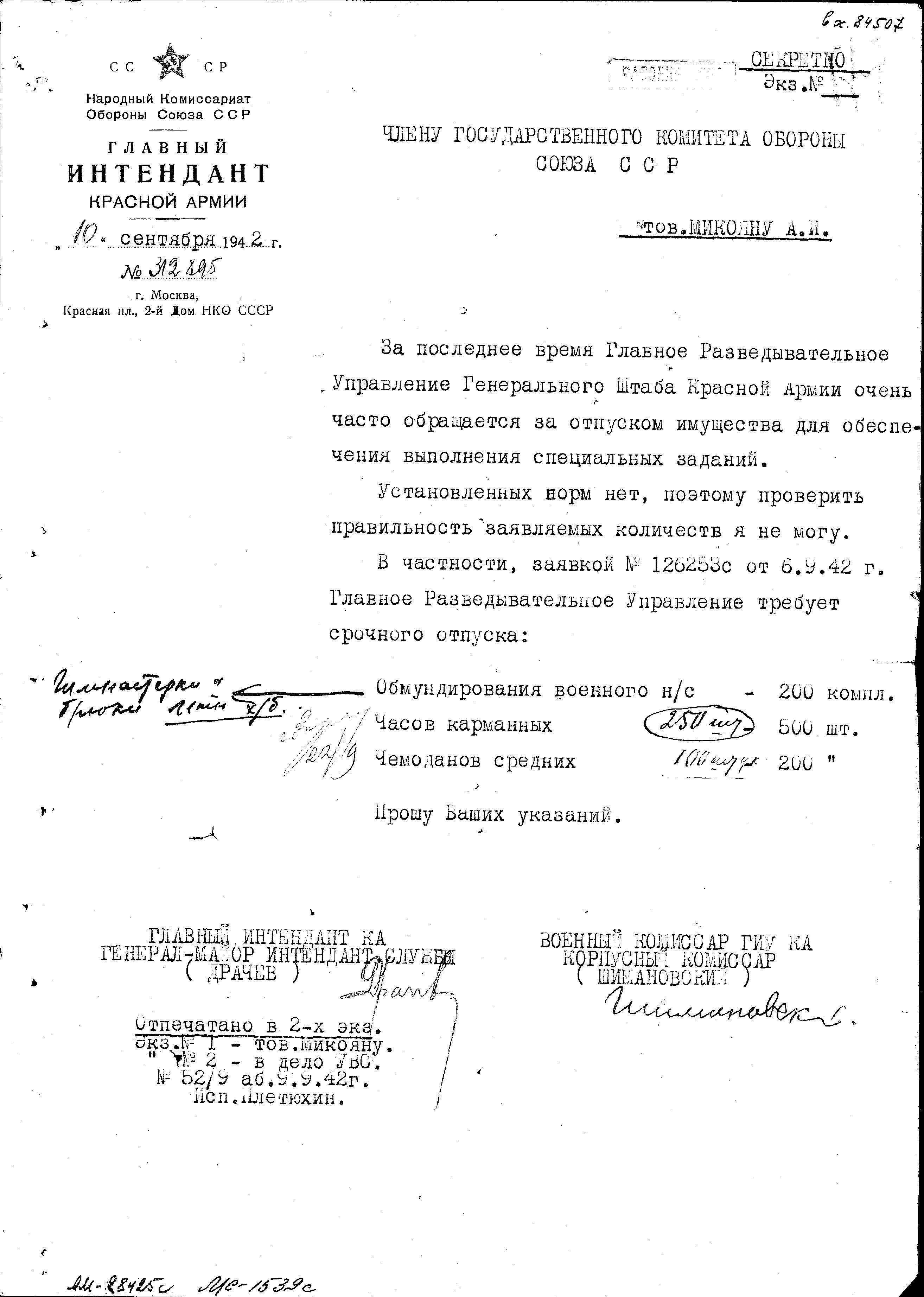 Основанием же для выдачи импортных вещей всем остальным: вольнонаёмному составу НКО СССР, труженикам предприятий и прочим, являлось постановление Совета Народных Комиссаров СССР. СНК СССР, своим распоряжением устанавливал перечень передаваемого импортного имущества, его количество и разрешал Наркомвнешторгу СССР, занимавшемуся получением и оплатой импортных поставок, передать его работникам других Наркоматов.