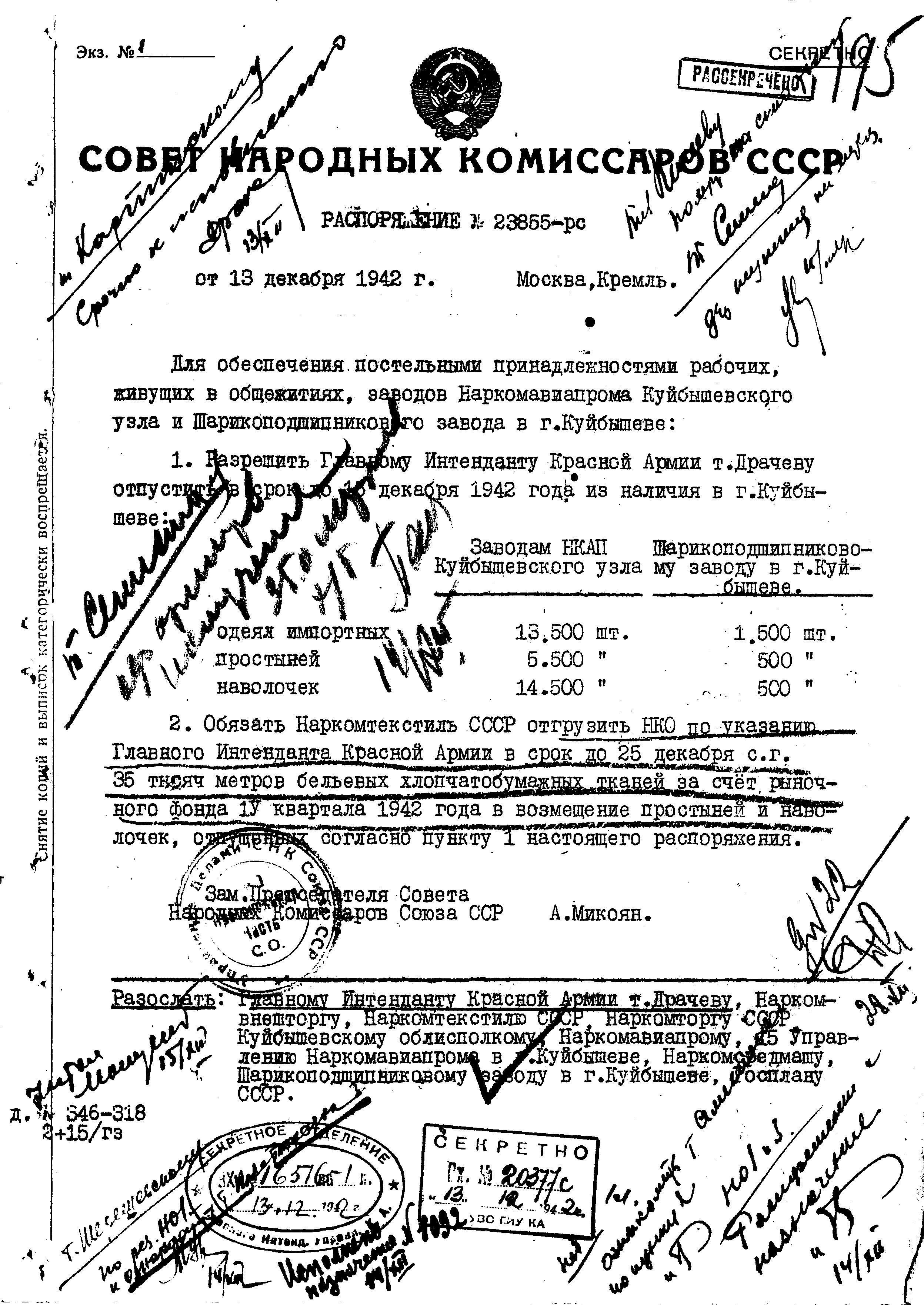 д/с: Распоряжение Совета Народных Комиссаров СССР об обеспечении постельными принадлежностями рабочих