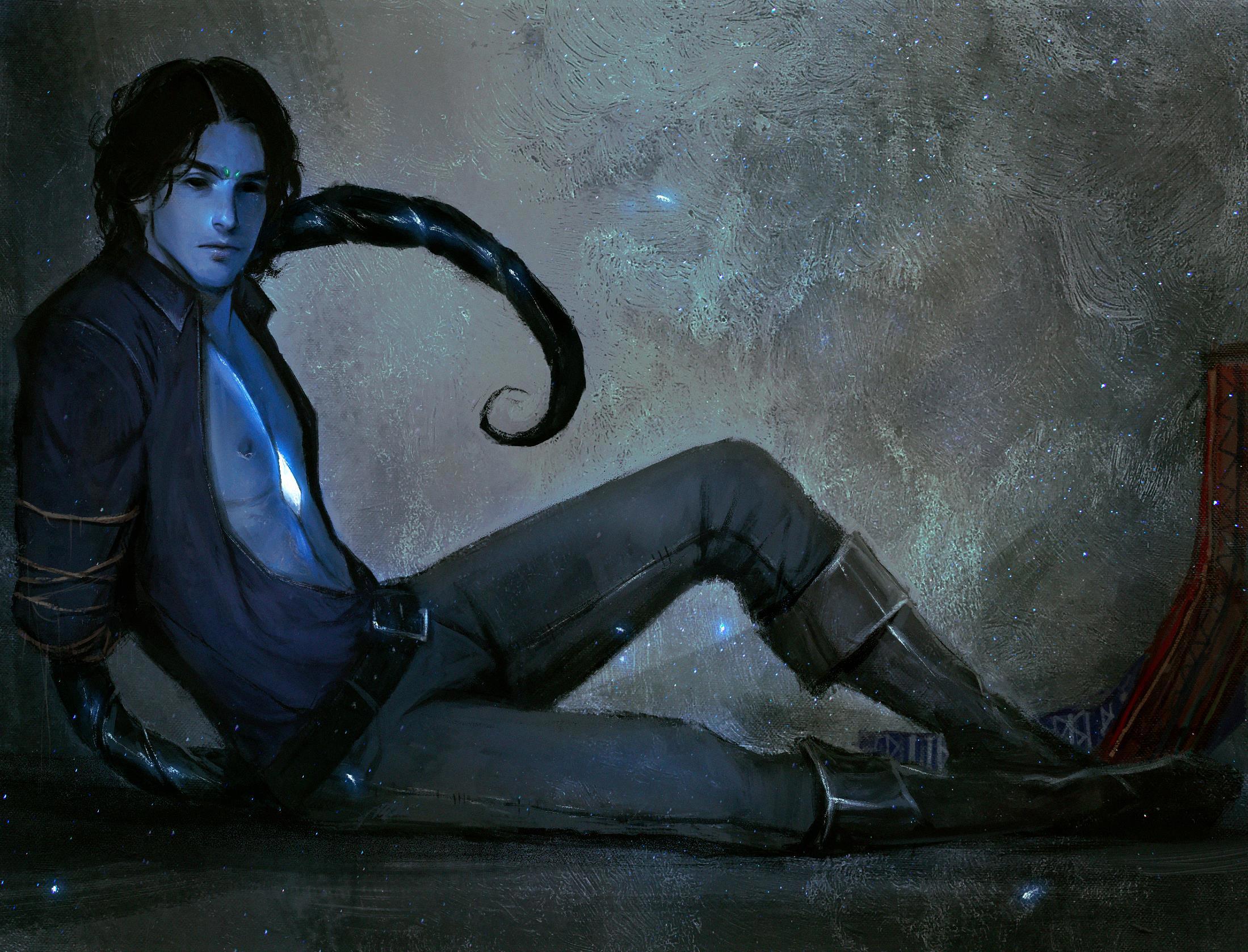Автор: Эльма ЗеленжарЯна PANDA нарисовала Иргесса, персонажа моего романа Танец с чашами. Исход благодати в момент плена. Кстати, в хламиде на обложке - именно он. А тут сидит и недовольно смотрит, изогнув хвост со смертоносным (или нет?) жалом. Как только развяжется, всем мало не покажется.