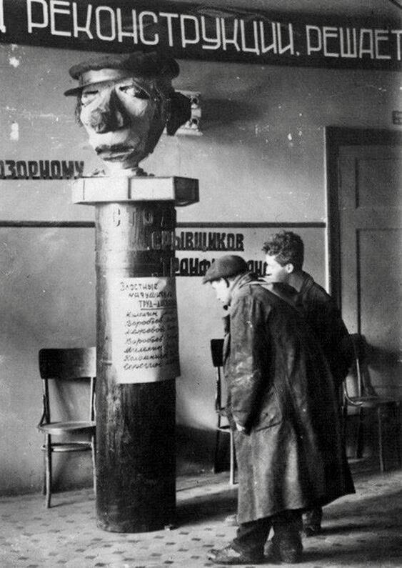 1932 год, СССР, Московская обл., ст.Ховрино. Позорный столб с фамилиями нарушителей дисциплины.