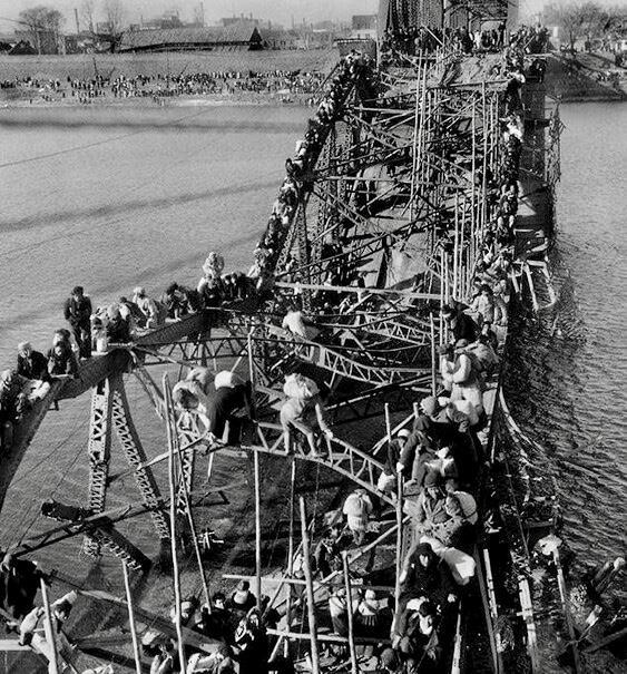 1950 год. Корейские беженцы покидают Северную Корею, преодолевая искореженный в результате авиаудара мост.