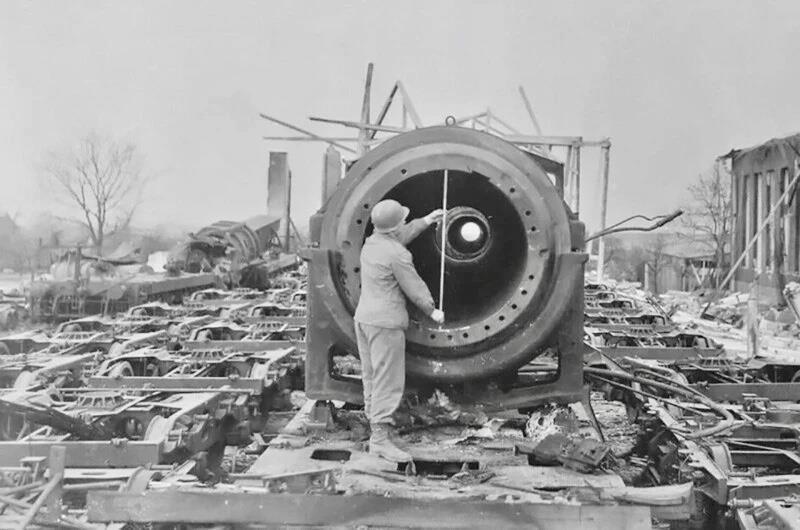 1945 год, Германия. Американский военнослужащий замеряет калибр немецкого сверхтяжелого 800-мм железнодорожного орудия «Дора» (80-cm-Kanone (E). 19 апреля 1945 года орудие было подорвано немцами в 36 км от Ауэрбаха (Бавария). Слева видна взорванная люлька второго орудия «Толстый Густав» 80-cm-Kanone (E).