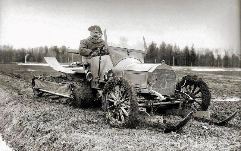 1913 год, Царское Село. Князь В.Н.Орлов за рулём Mercedes-Kégresse № 3 во время испытаний по весенней распутице. В целях защиты от грязи установлены задние крылья, движитель прикрыт брезентовыми кожухами. Применена новая конструкция лыж.