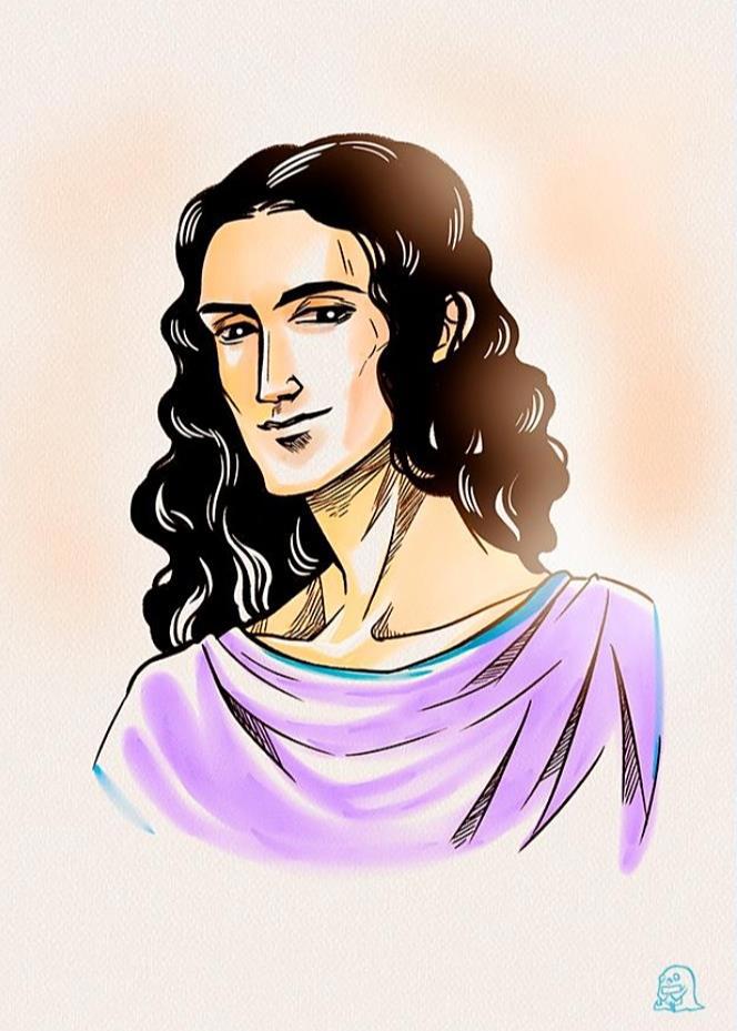 Что-то близкое к итальянцу, но худоба болезненная, взгляд насмешливый и слегка безумный. Носит тогу или тунику фиолетового цвета с серебристой или синей каймой…"