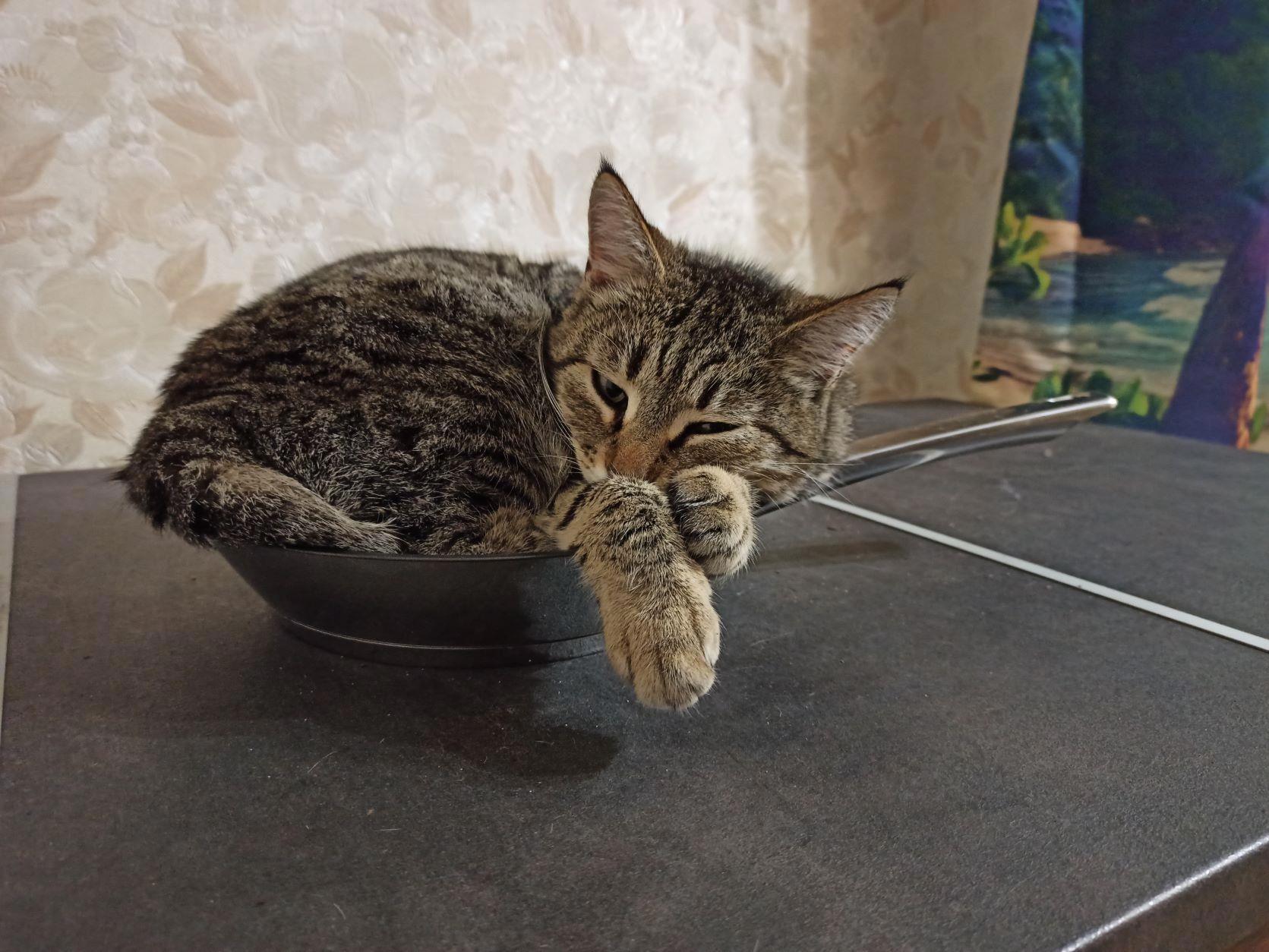 Автор: Д. СтаничИ снова киса, которая любит необычные места для сна. В этой сковородке киса и правда спала насколько дней подряд. Не помещалась, страдала, но все равно спала, в разных позах.