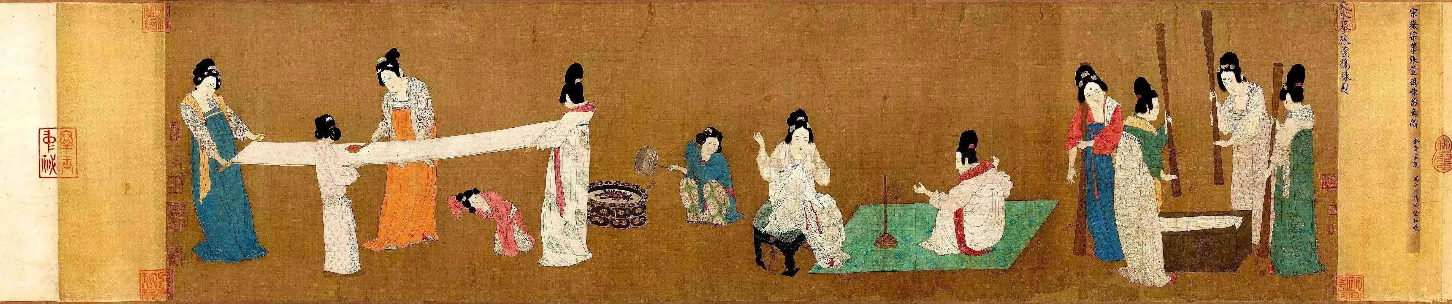 На картине изображена церемония сбора тутовых листьев и изготовления шелка, которую выполняли весной дамы императорского гарема.