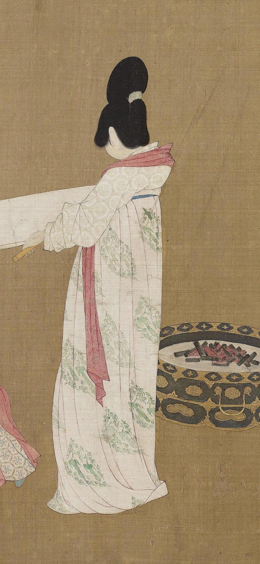 - наложница прядет шелк, другая наложница шьет, еще одна - раздувает огонь в жаровне с помощью круглого веера,