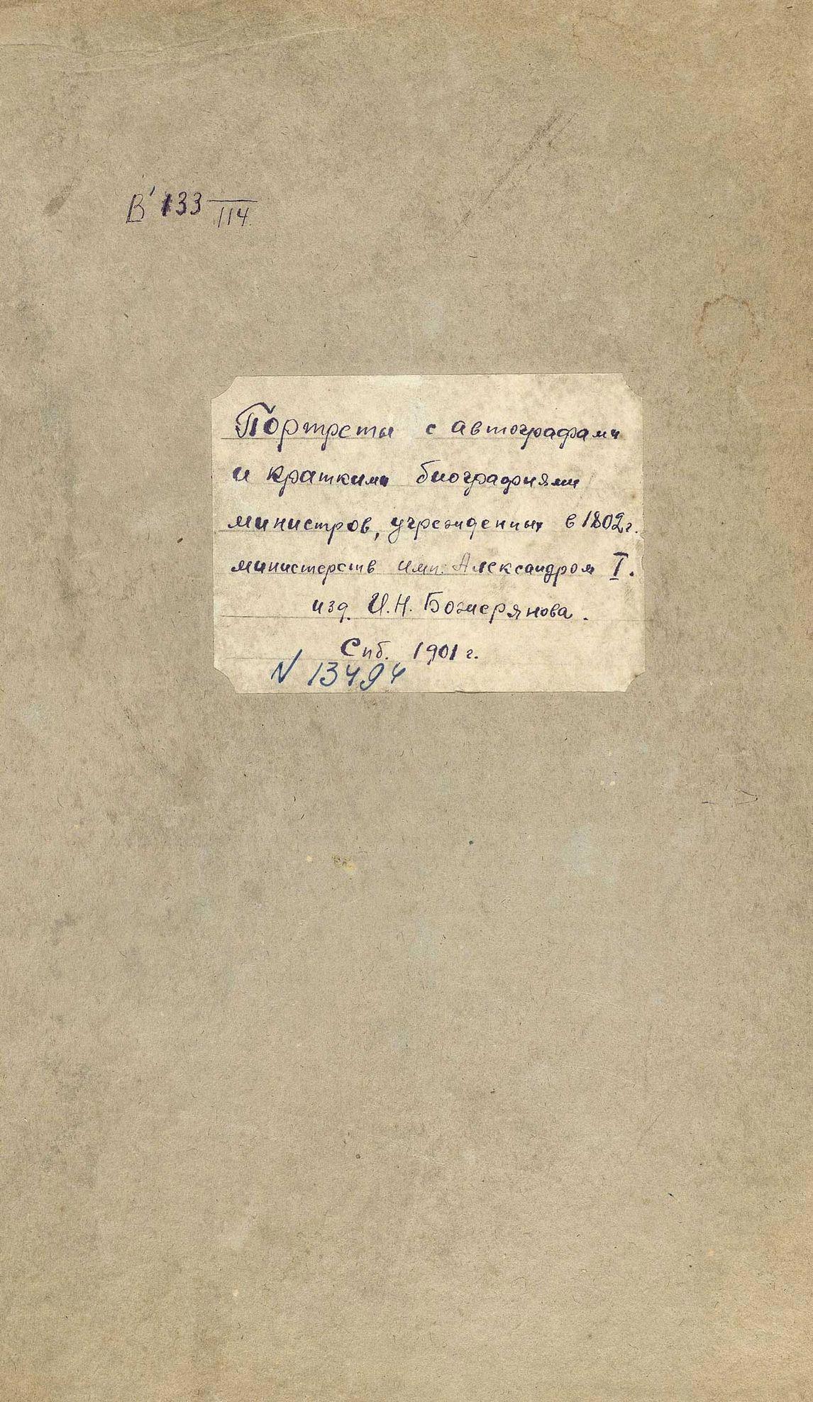 Автор: Homo VulgarisБожерянов, Иван Николаевич. Портреты с автографами и краткими биографиями министров учрежденных в 1802 г. министерств императором Александром I : Изд. И. Н. Божерянова, исп. фототипией, поставщика Двора Его Императорского Величества А. И. Вильборга. - СПб., 1901. - [34] с. : портр.