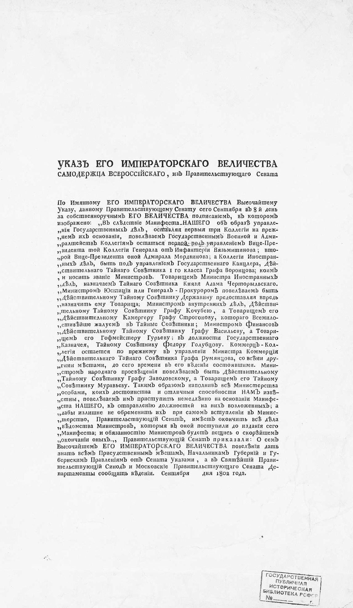 Портреты и биографии министров учреждённых в 1802 году императором Александром I министерств.