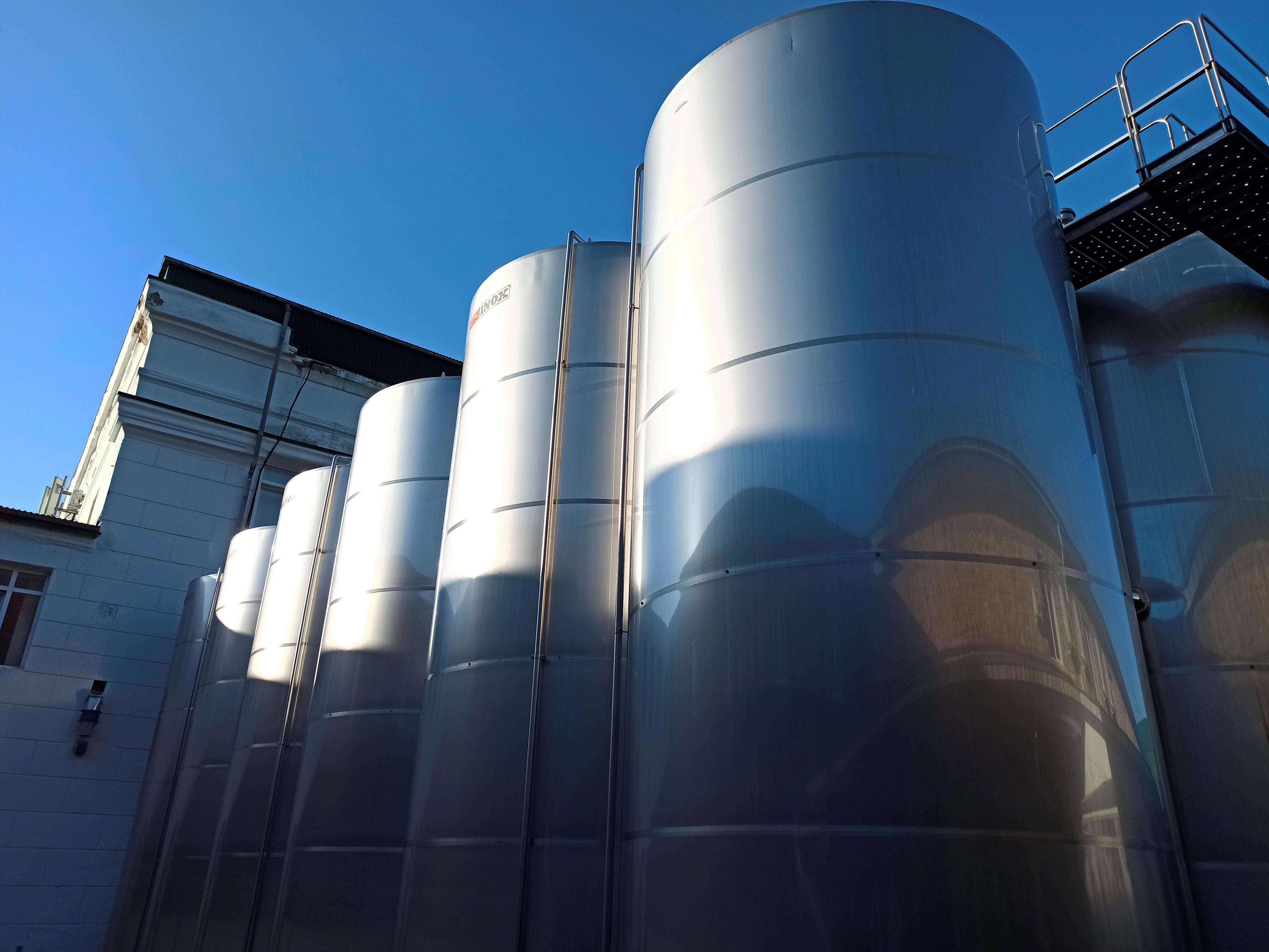 На улице. В этих больших цистернах делается шампанское, которое побюджетней.