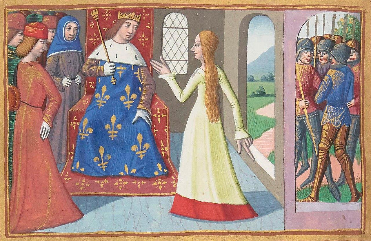 Жанна д'Арк убеждает Карла VII продолжить осаду Труа. Миниатюра из книги "Вигилии на смерть короля Карла VII". Конец XV века.
