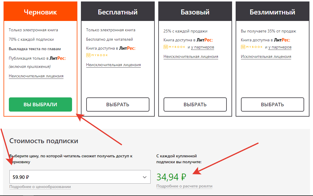 Пока что я не могу рассказать о отчислениях от готовой книги. Но о плюсах публикации черновика, очевидны. И ещё его нельзя никаким образом распространять бесплатно. Мин - 49.90, макс. - 990 р.