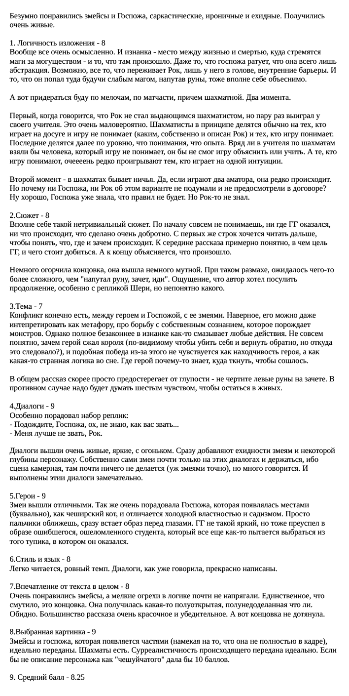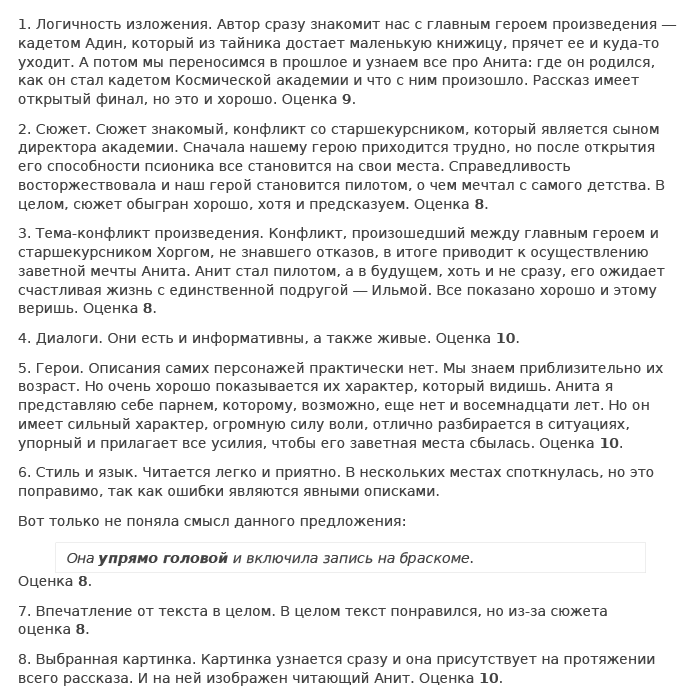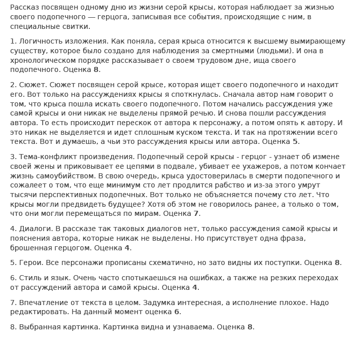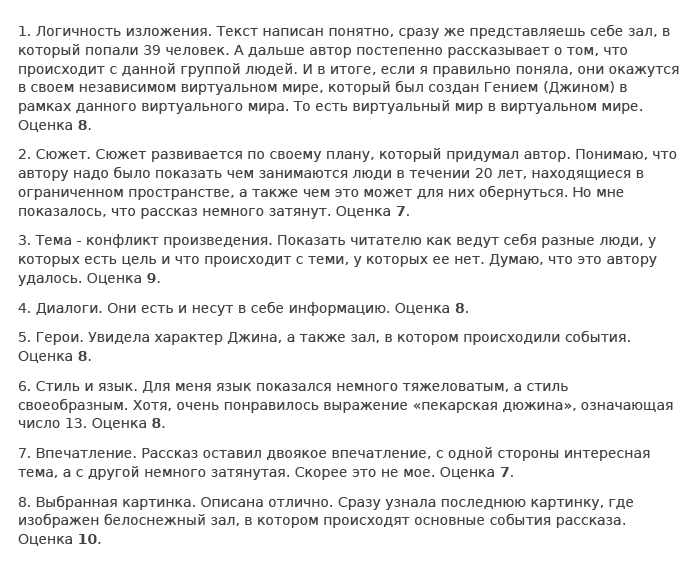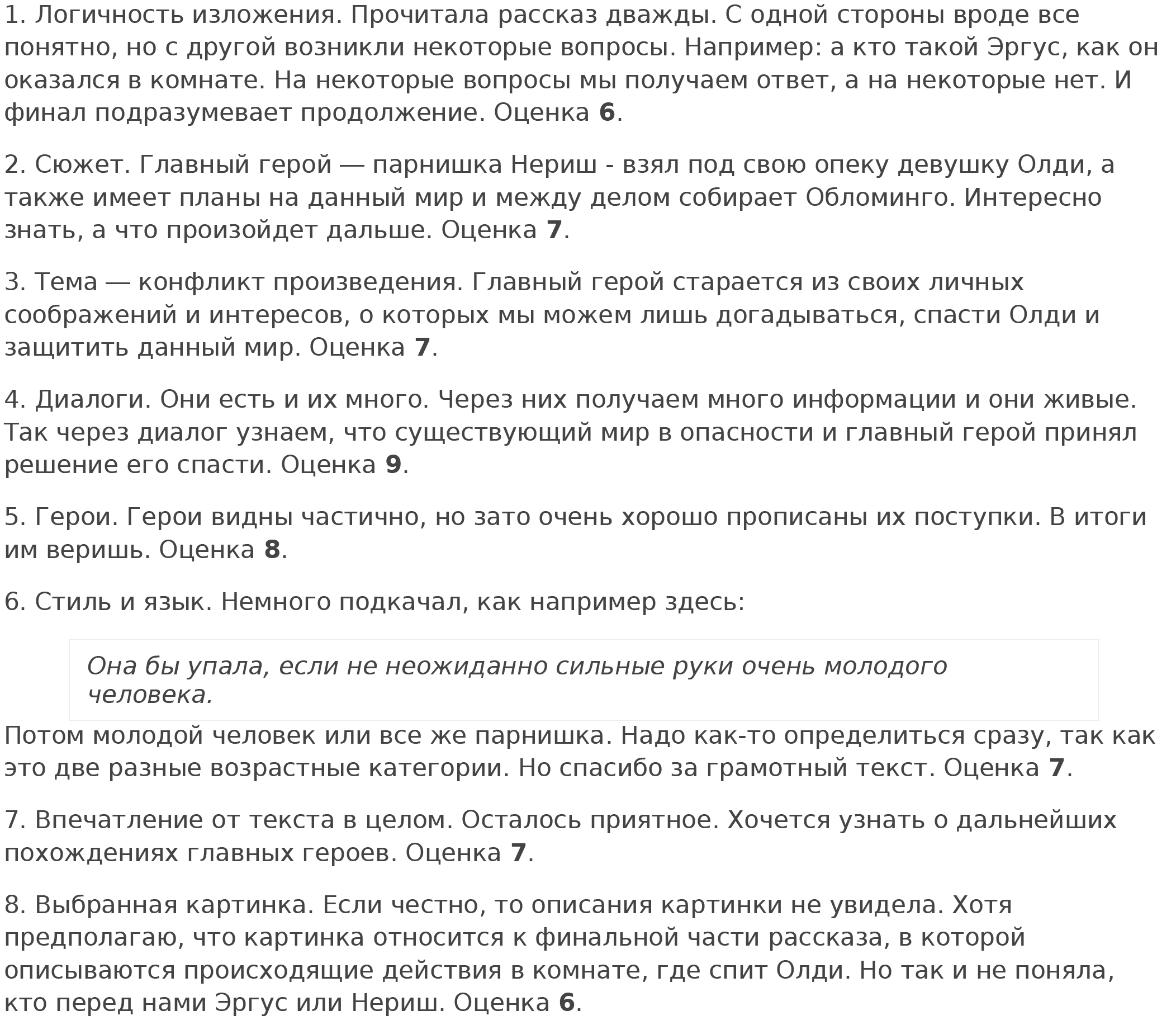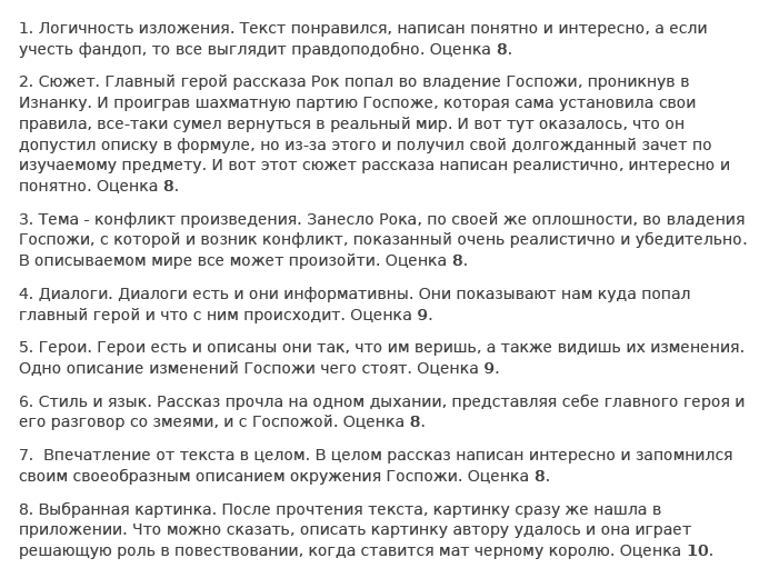 7. Впечатление от текста в целом. Еще раз повторюсь, текст оставил хорошее и приятное впечатление. Оценка 8.