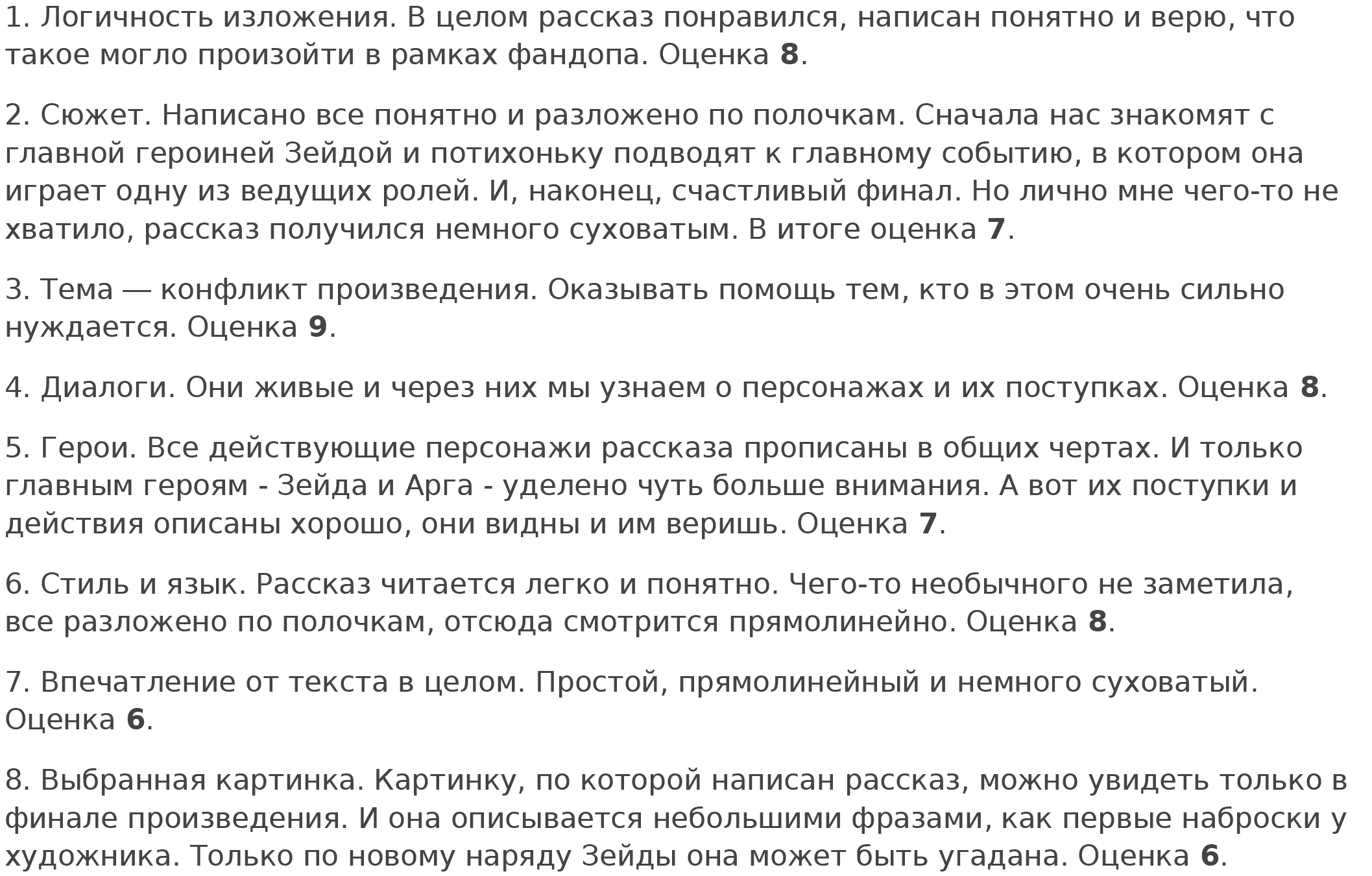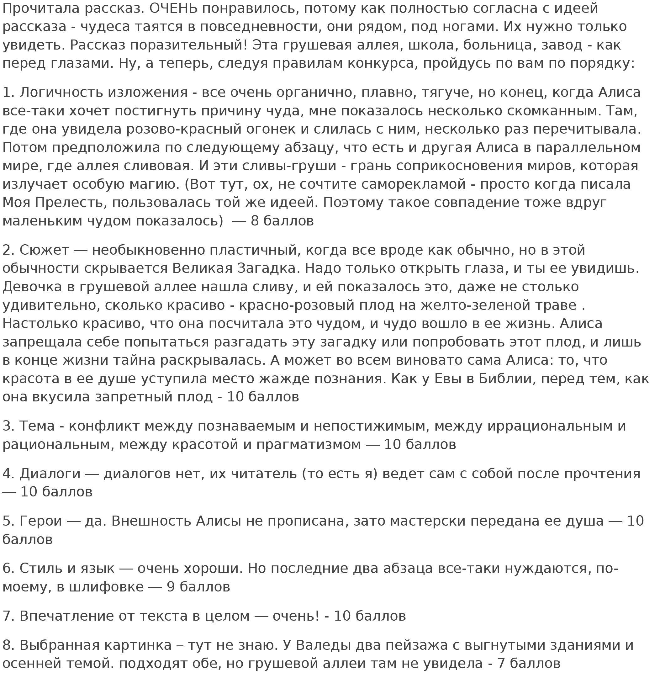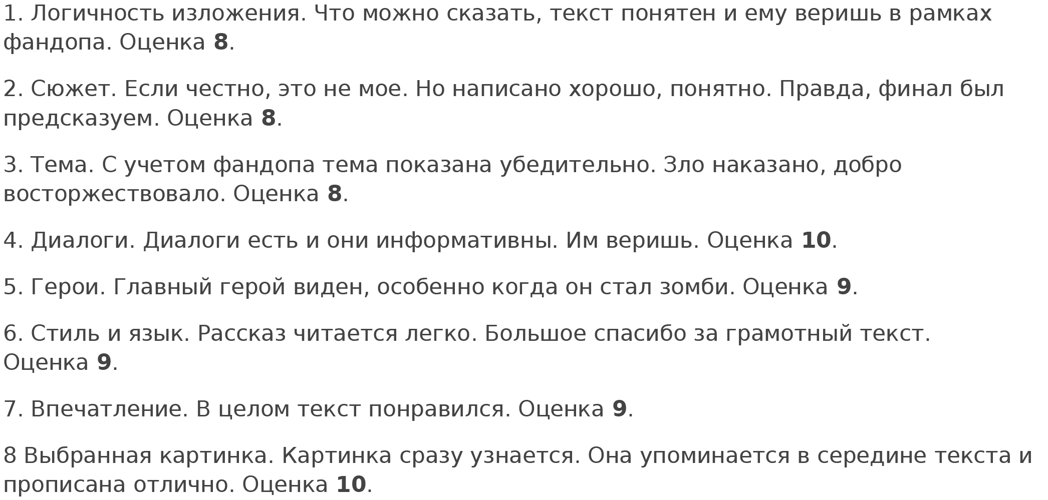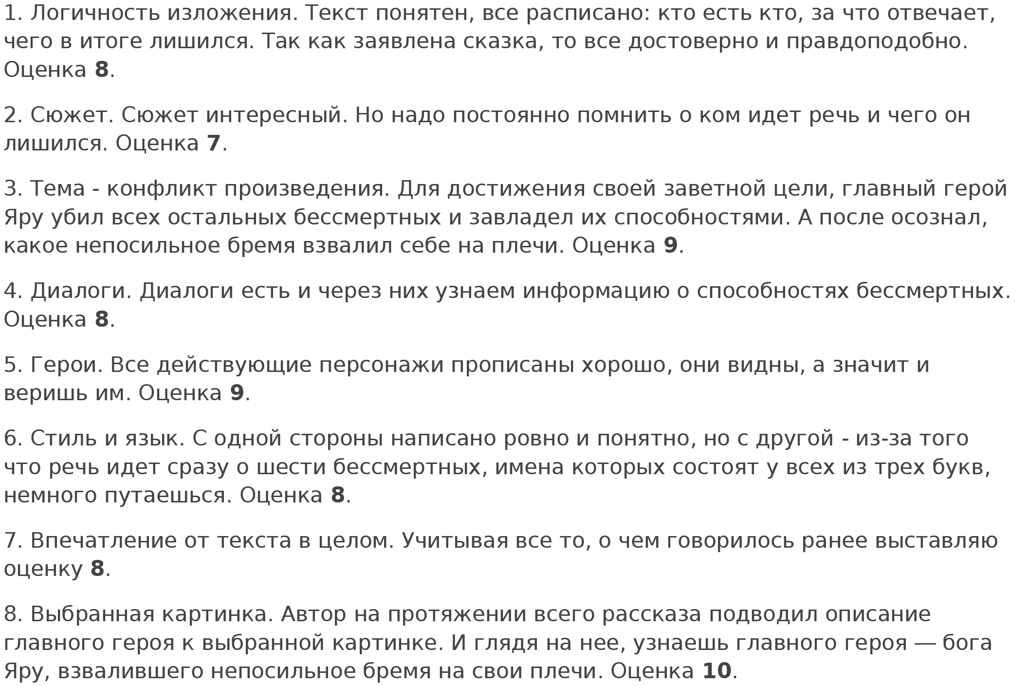 7. Впечатление от текста в целом. Еще раз повторюсь, текст оставил хорошее и приятное впечатление. Оценка 8.