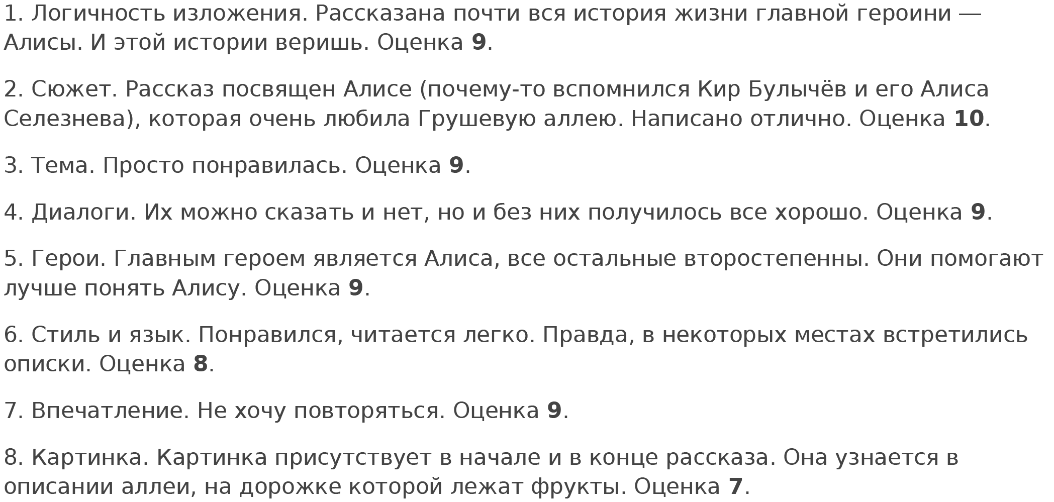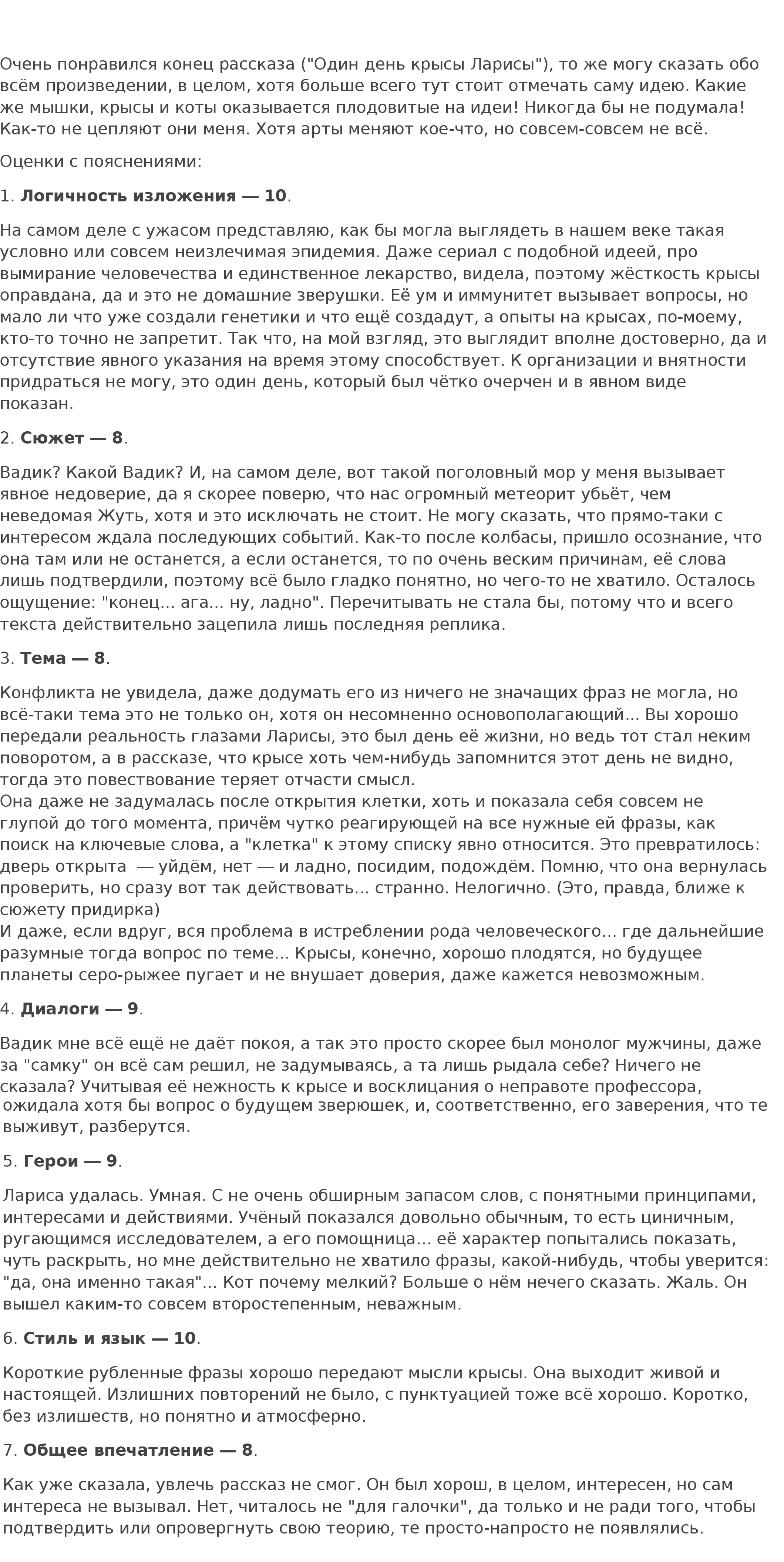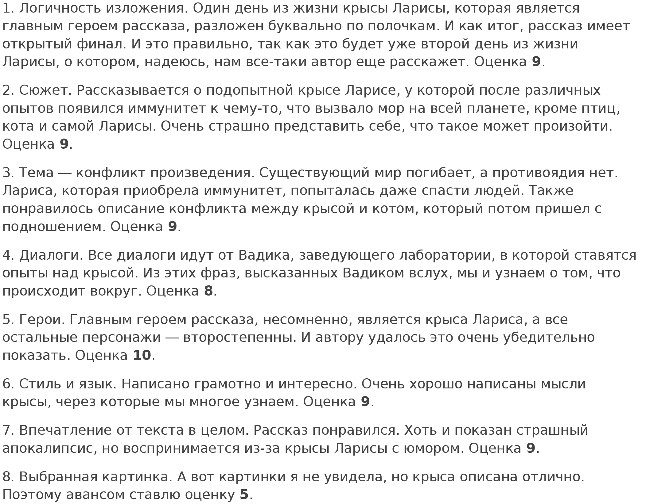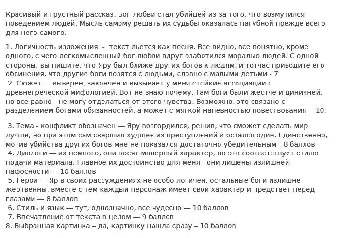7. Впечатление от текста в целом. Еще раз повторюсь, текст оставил хорошее и приятное впечатление. Оценка 8.