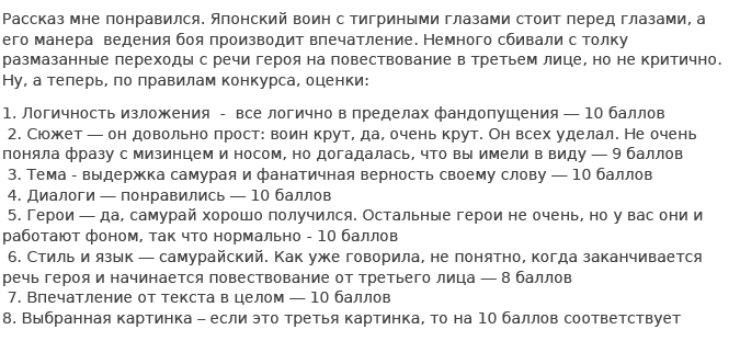 7. Впечатление от текста в целом — невзирая на отмеченные недостатки, достоинства с лихвой их перевешивают. Читала с удовольствием. Рассказ из тех, что запоминается