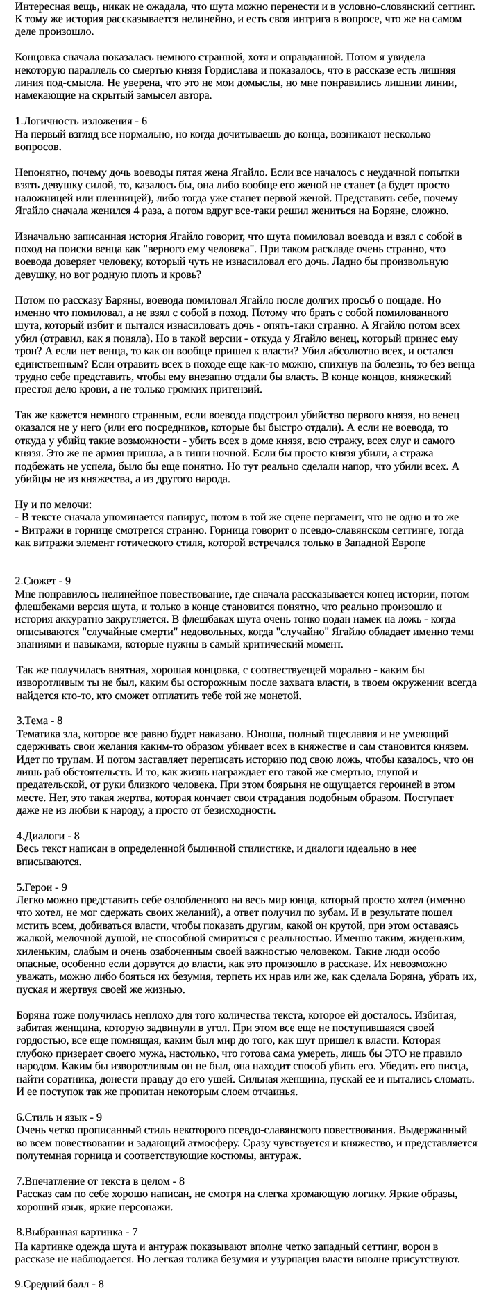 2. Сюжет. Очень интересный и развивается как-бы по спирали, описывая к чему, в итоге, привело убийство князя Любомира. Пересказывать не буду. Если кому-то будет интересно узнать об этом, прочтет рассказ сам. Оценка 8.