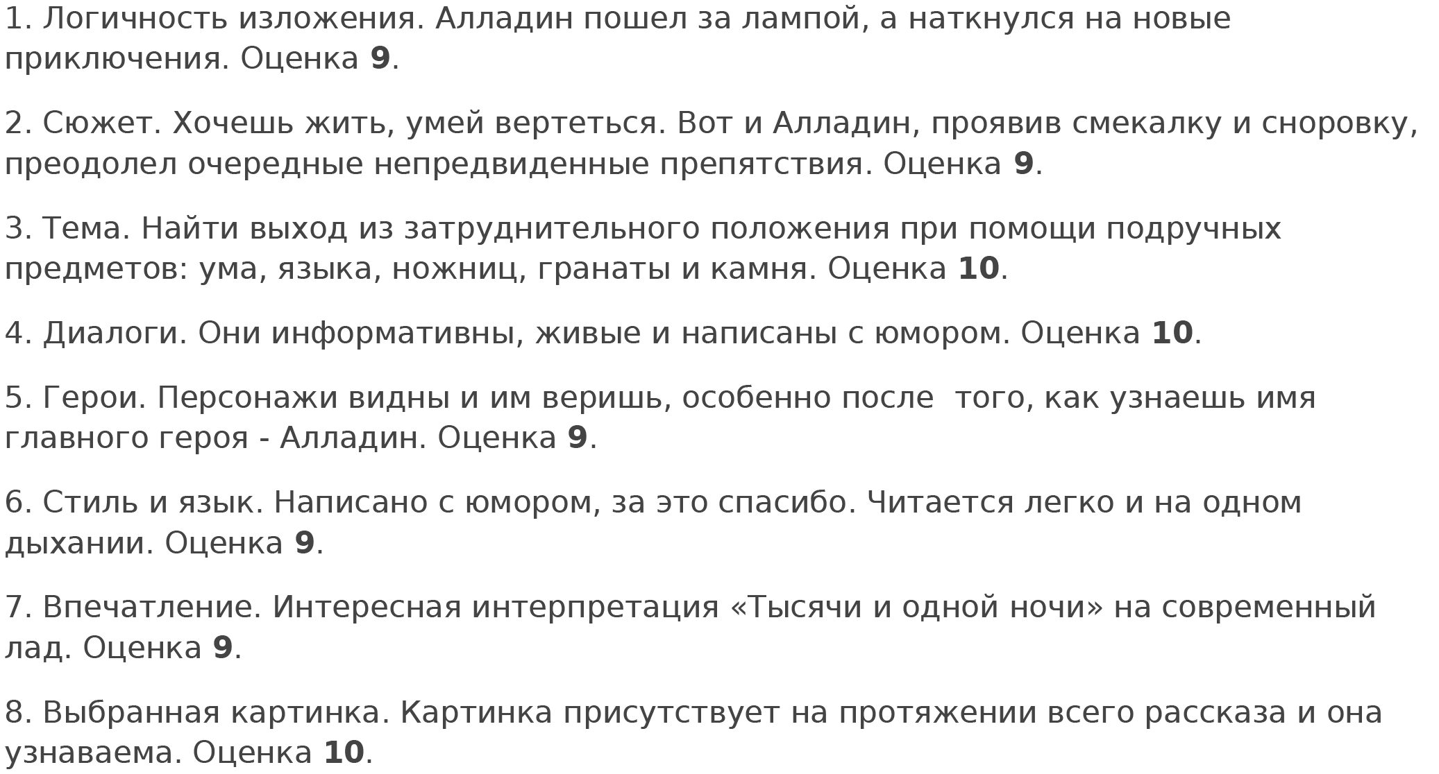 1. Логичность изложения - все понятно, Алладин, граната, гули и мешок хорошего юмора — 10 баллов