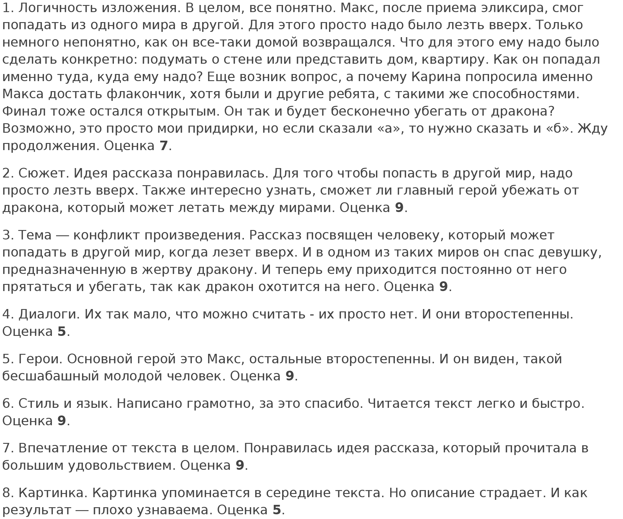 1. Логичность изложения - признаться, вопросы есть. Как Макс попадал к себе домой? Я поняла, что перемещение осуществлялось в процессе ползанья вверх по отвесным стенам и благодаря эликсиру мамы Карины. Но вот процесс перемещения по мирам получился хаотичным, а возвращение домой и вовсе не обозначено. Опять же Карина и компания других «паркурщиков» по мирам – они даны очень схематично и вызывают желание узнать их получше. Почему они сами не могут доставать себе нужные ингредиенты (кстати, для чего?), а посылают Макса? Вопросов много, но это не умоляет качества текста, просто он напоминает зарисовку для будущего романа, чем законченное произведение (шепотом: сама этим грешу) — 7 баллов
