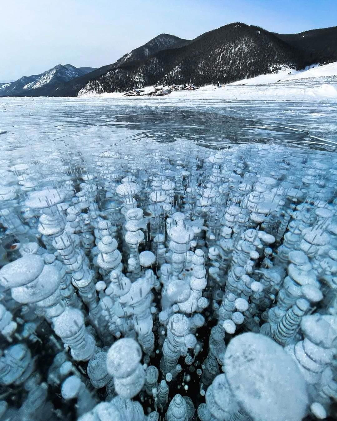 Замерзшие пузыри на озере Байкал.