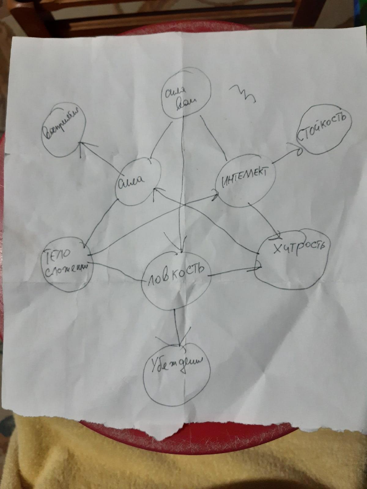 И тут мне на ум пришла система характеристик в серии Dragone Age, где вторичными характеристиками были именно те, кто так чудесно вписался в систему, которую вы видите на листке.