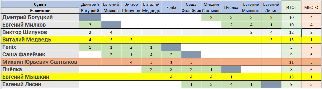 | 1-е место Барабанная дробь!!! Бамс!!! А, вот, первое место, на сей раз, набрав по 13 баллов, поделили Евгений Мышкин с рассказом Черный неон и Виталий Медведь с рассказом Киберспорт Поздравляю!!! | |